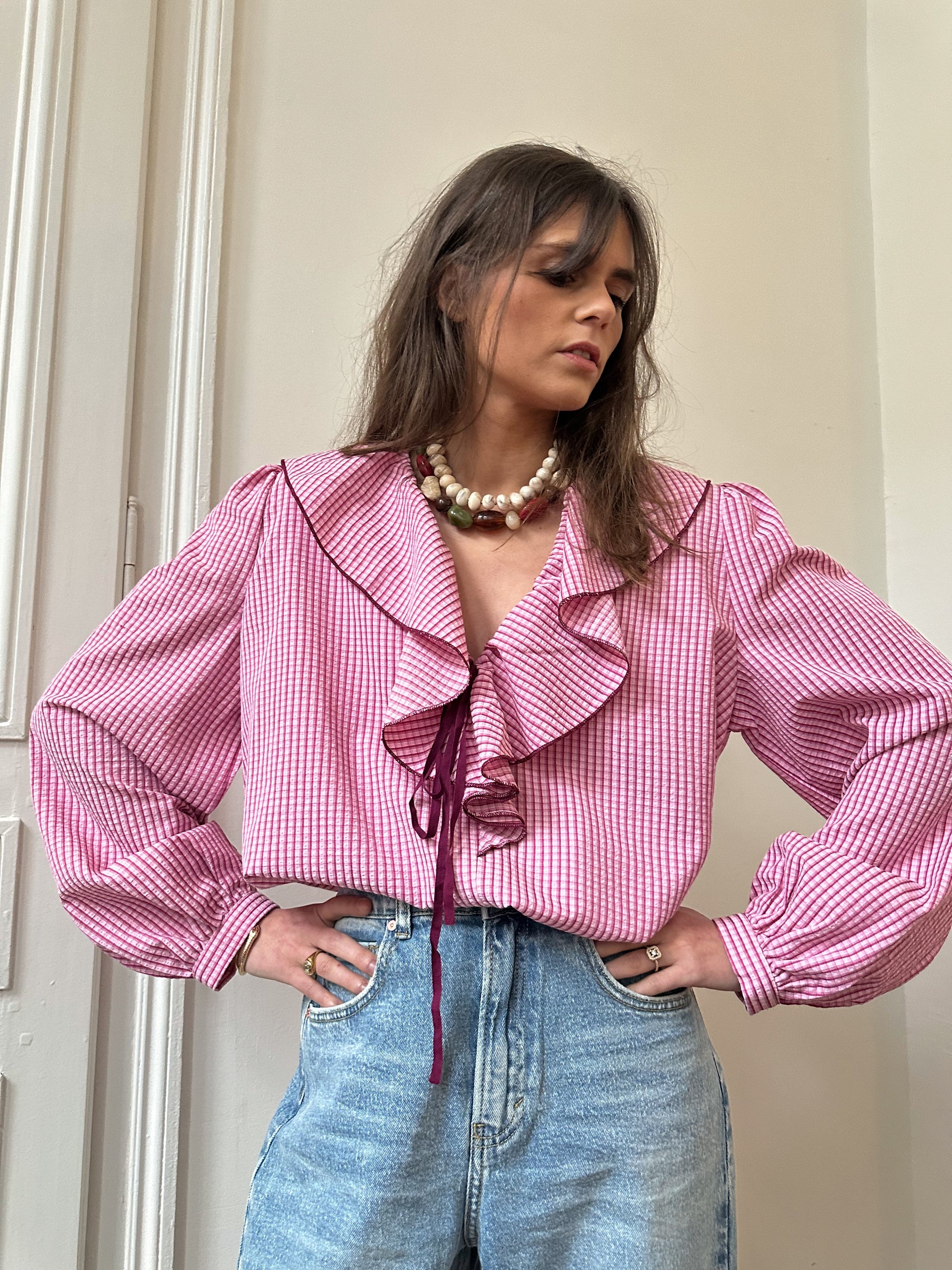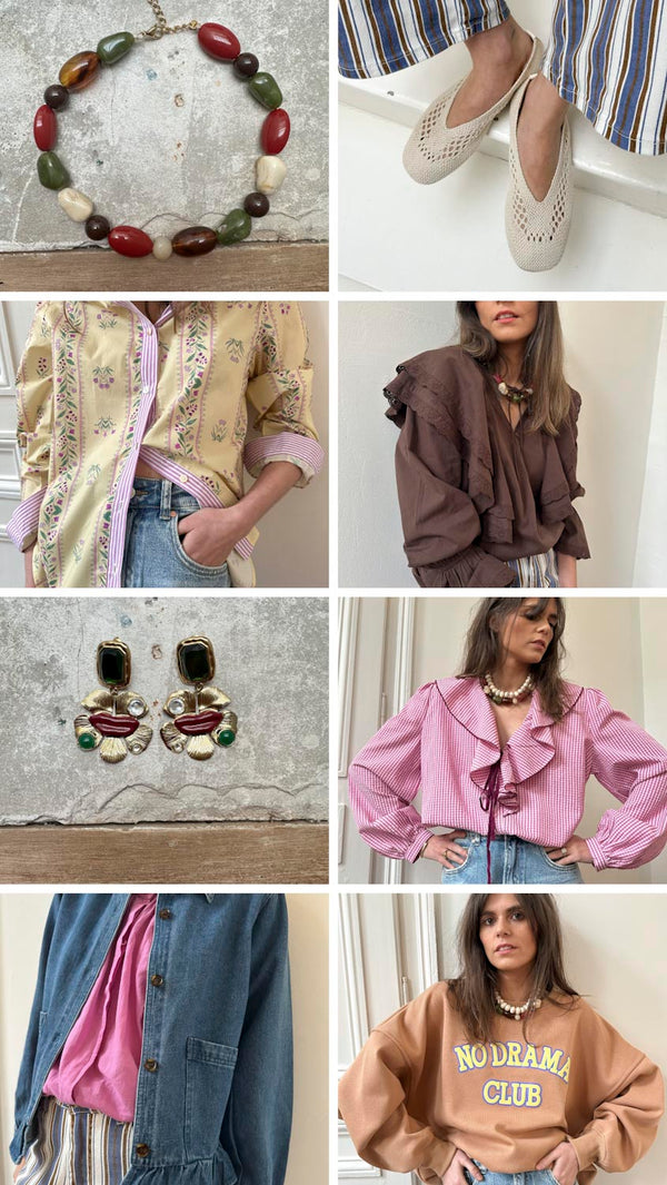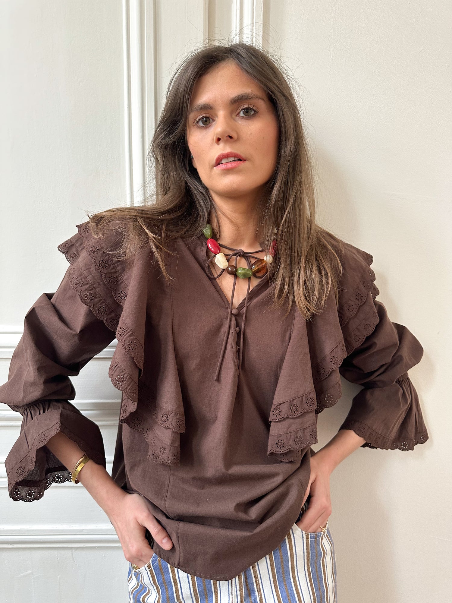 Un look simple, mais avec une vraie présence.Le pantalon Marine, pièce centrale de la silhouette, est équilibré par la blouse Clovis chocolat et ses détails bohèmes, subtilement repris dans les accessoires.