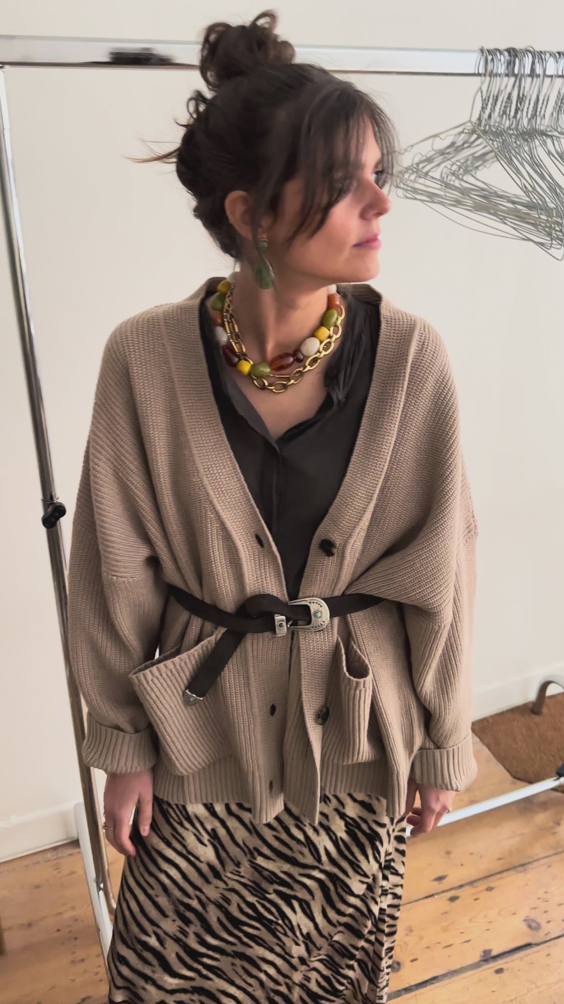 Une jupe longue soyeuse zébrée qu'on vient calmer avec un gilet bien loose qu'on peut ceinturer pour y donner de la structure.