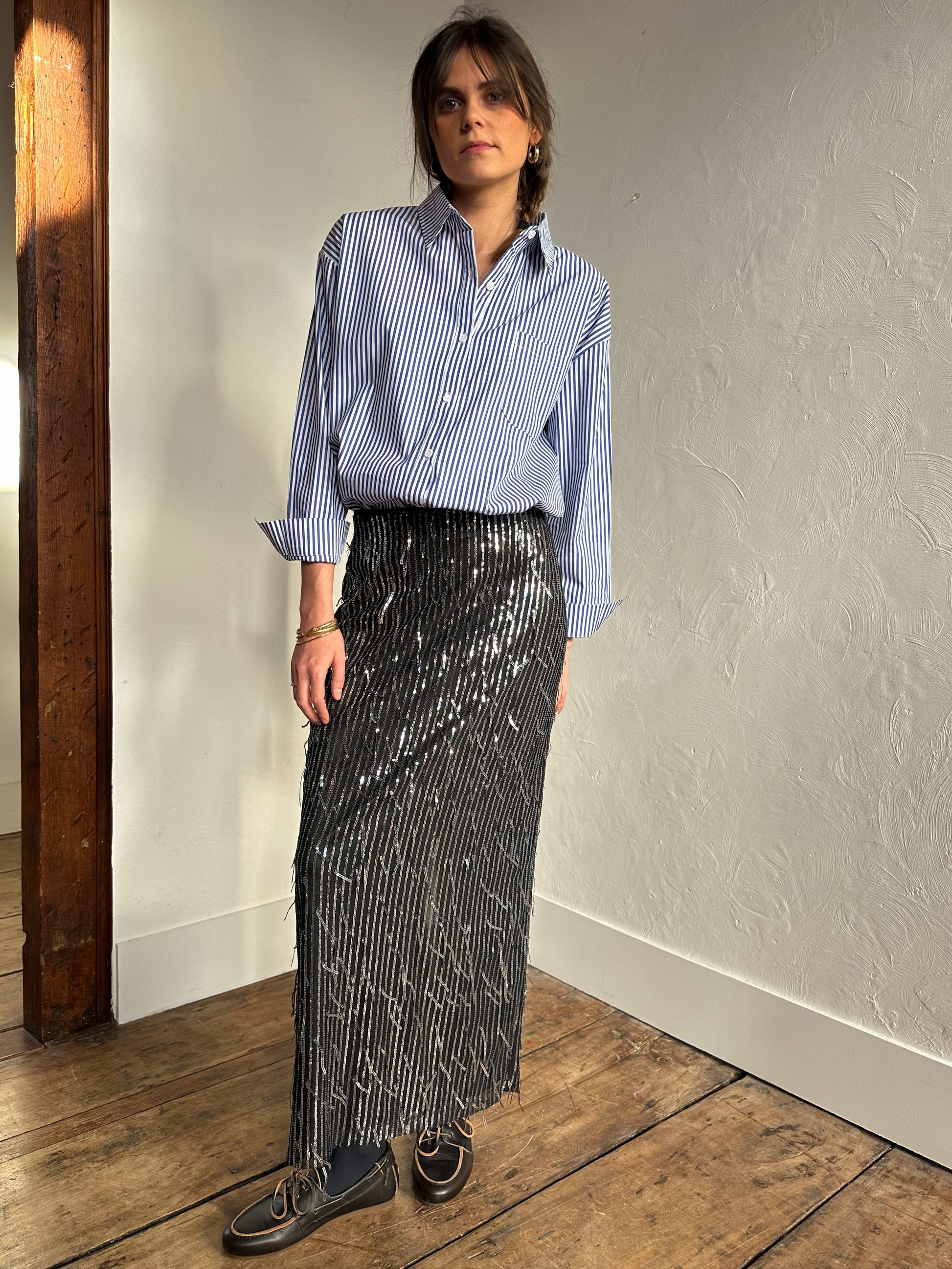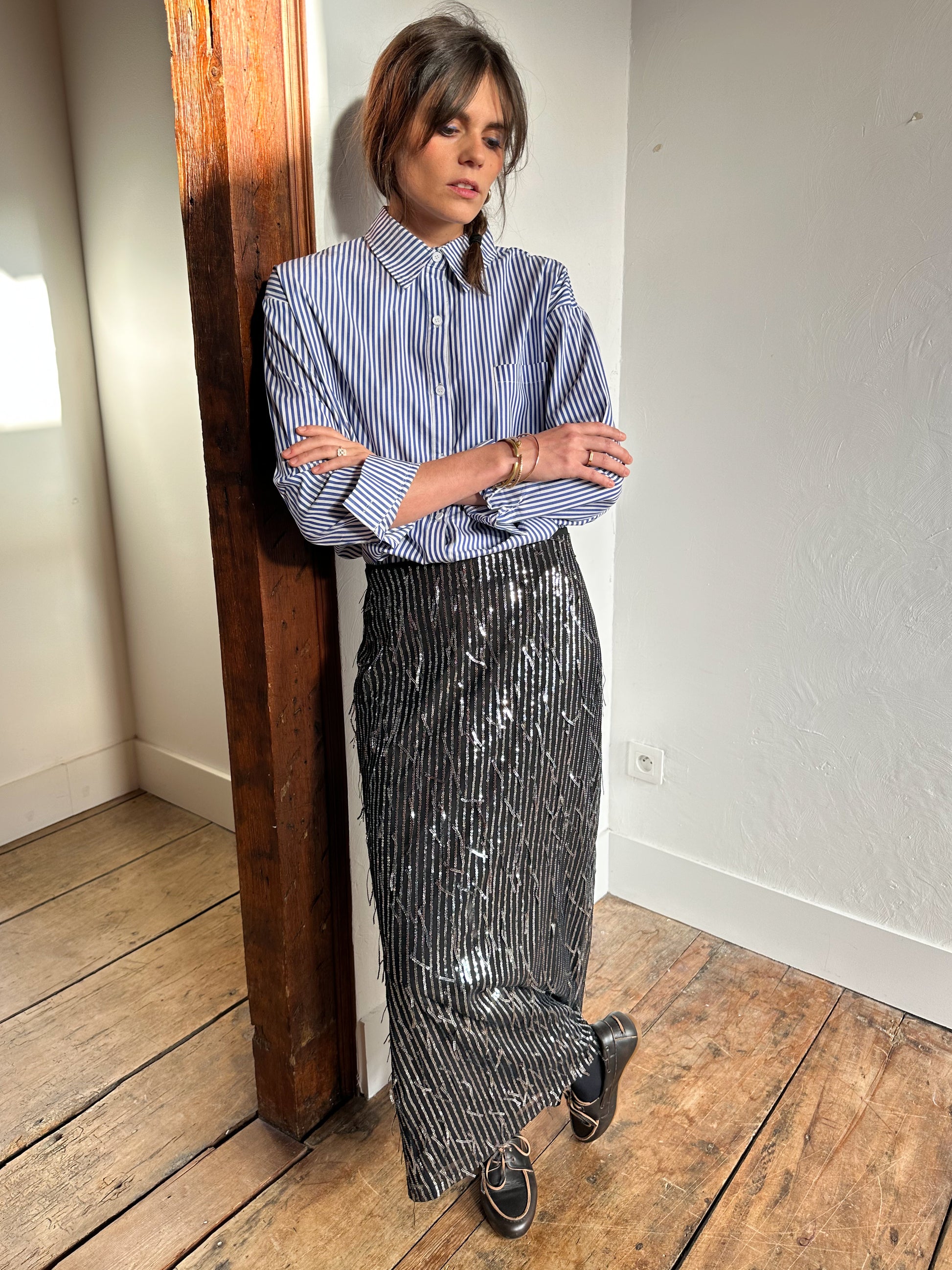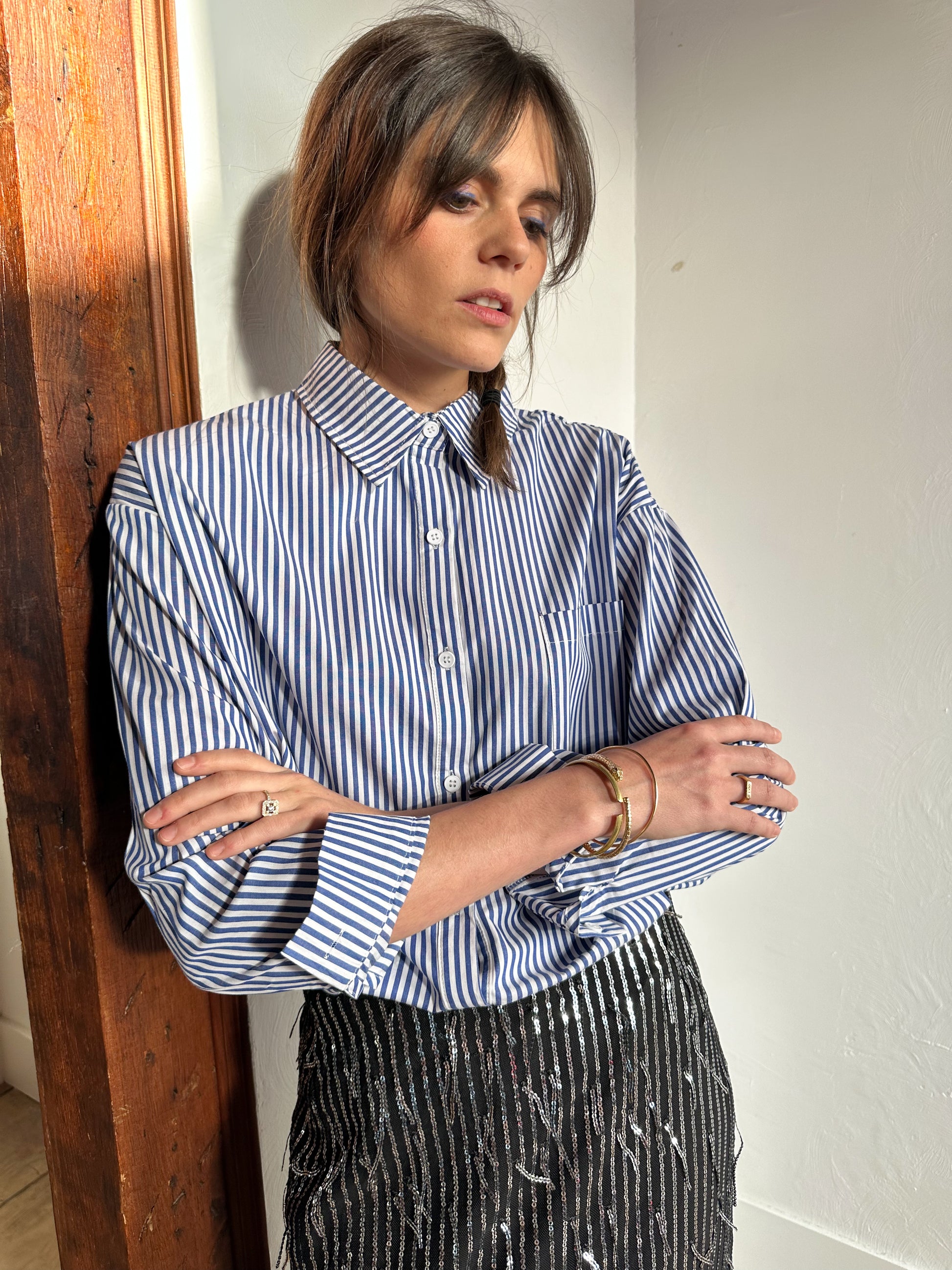 The AVELINE shirt is a wardrobe staple for a timeless yet casual style. It features thin navy blue and White vertical stripes White elongate the silhouette.