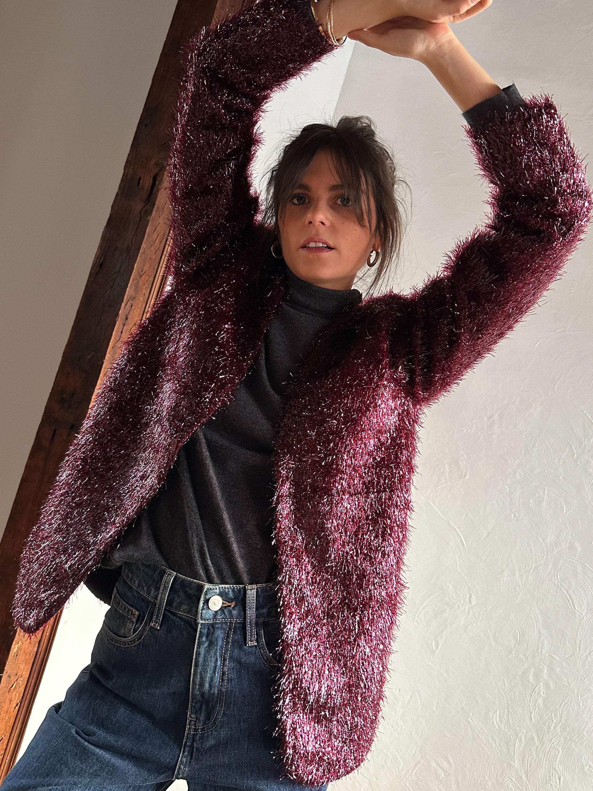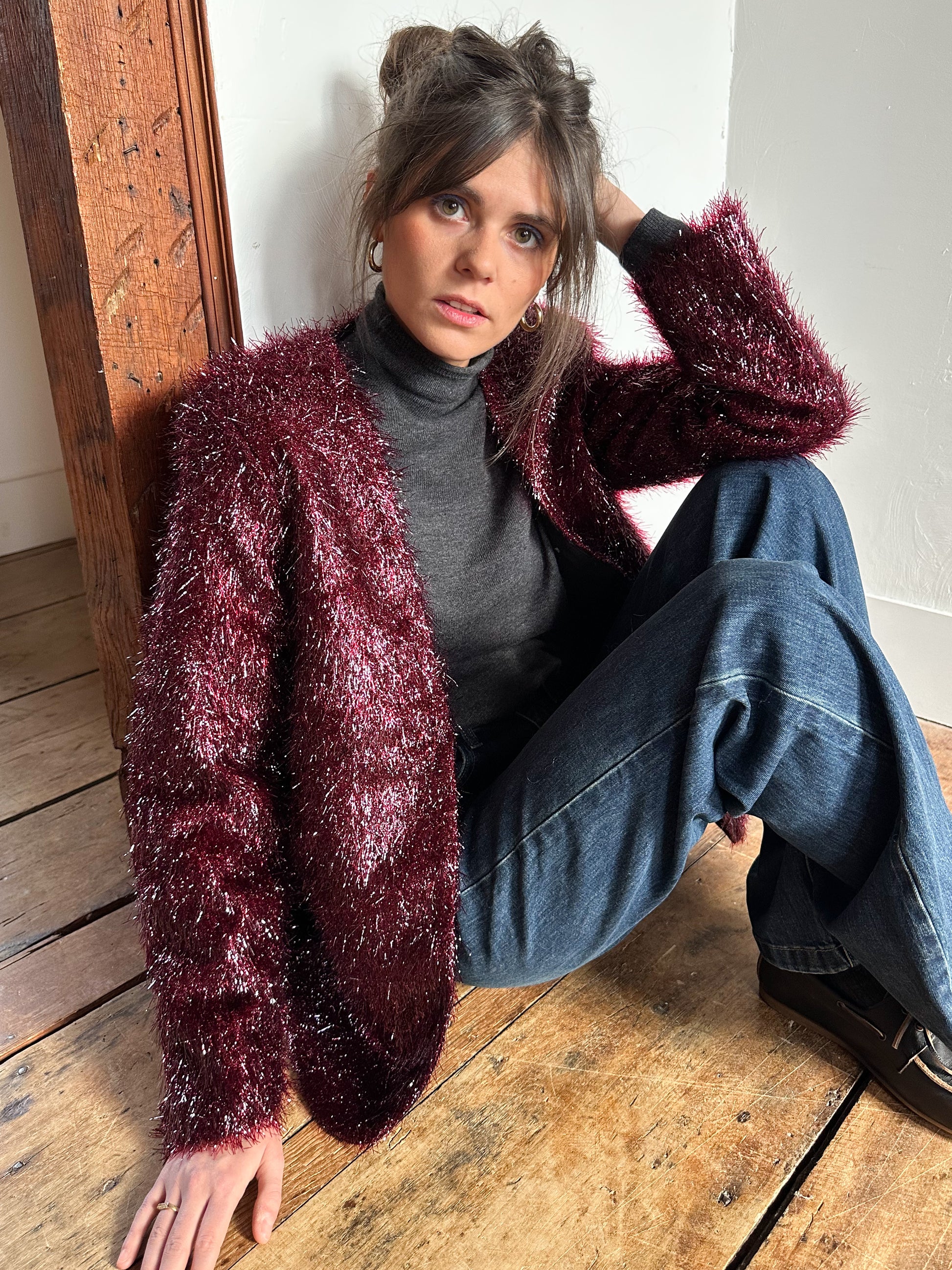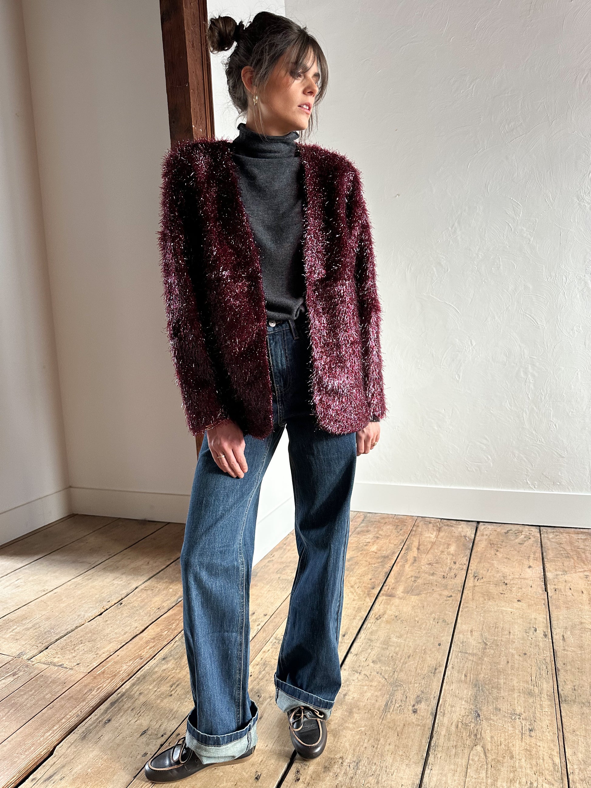 Dare to be subtly extravagant with the JEANNE shiny fur jacket. Its luminous fur-like texture is enhanced by a deep, chic plum color, perfect for brightening up your evening or winter outfits. This piece combines boldness and structure for a memorable look!