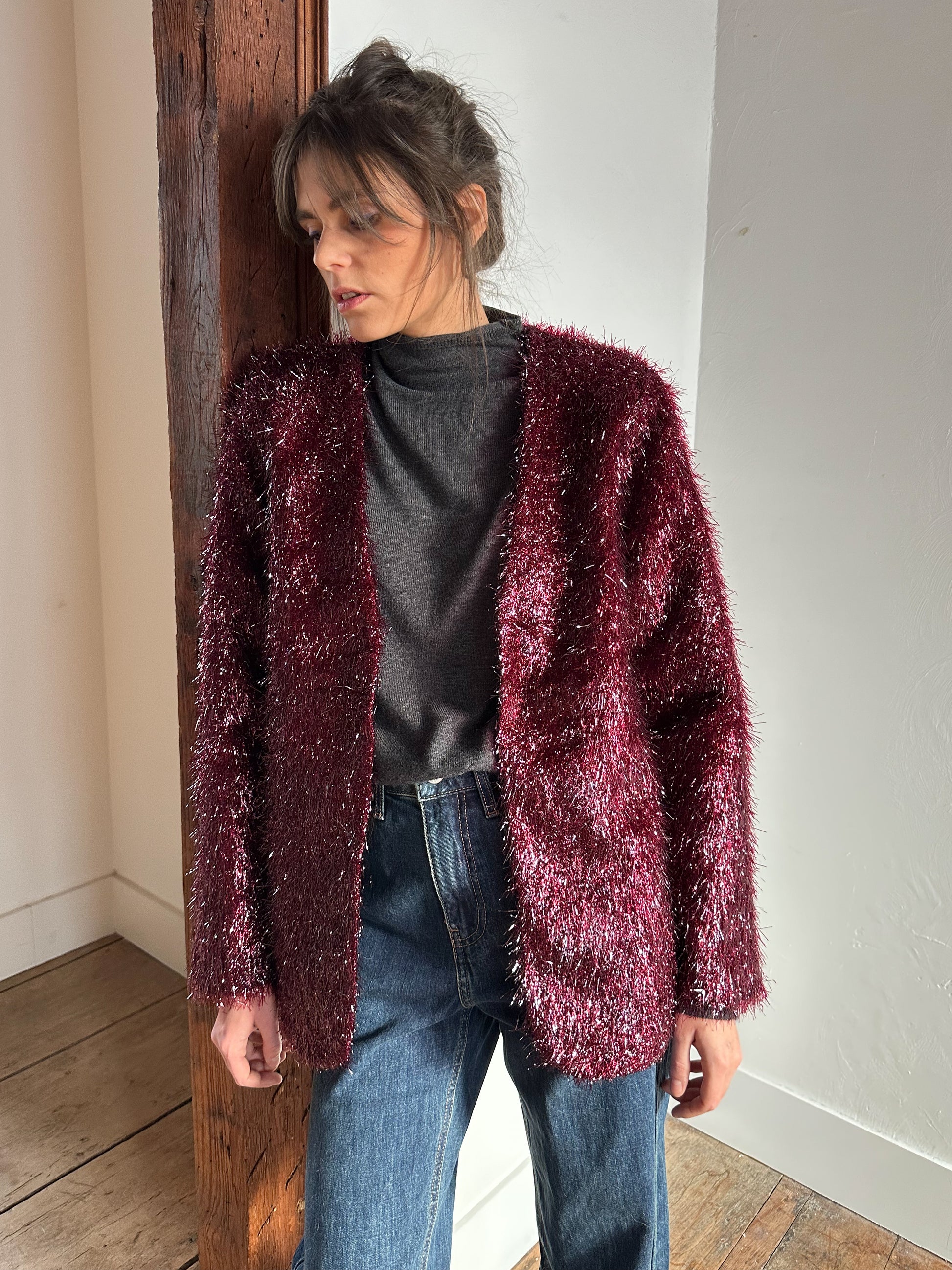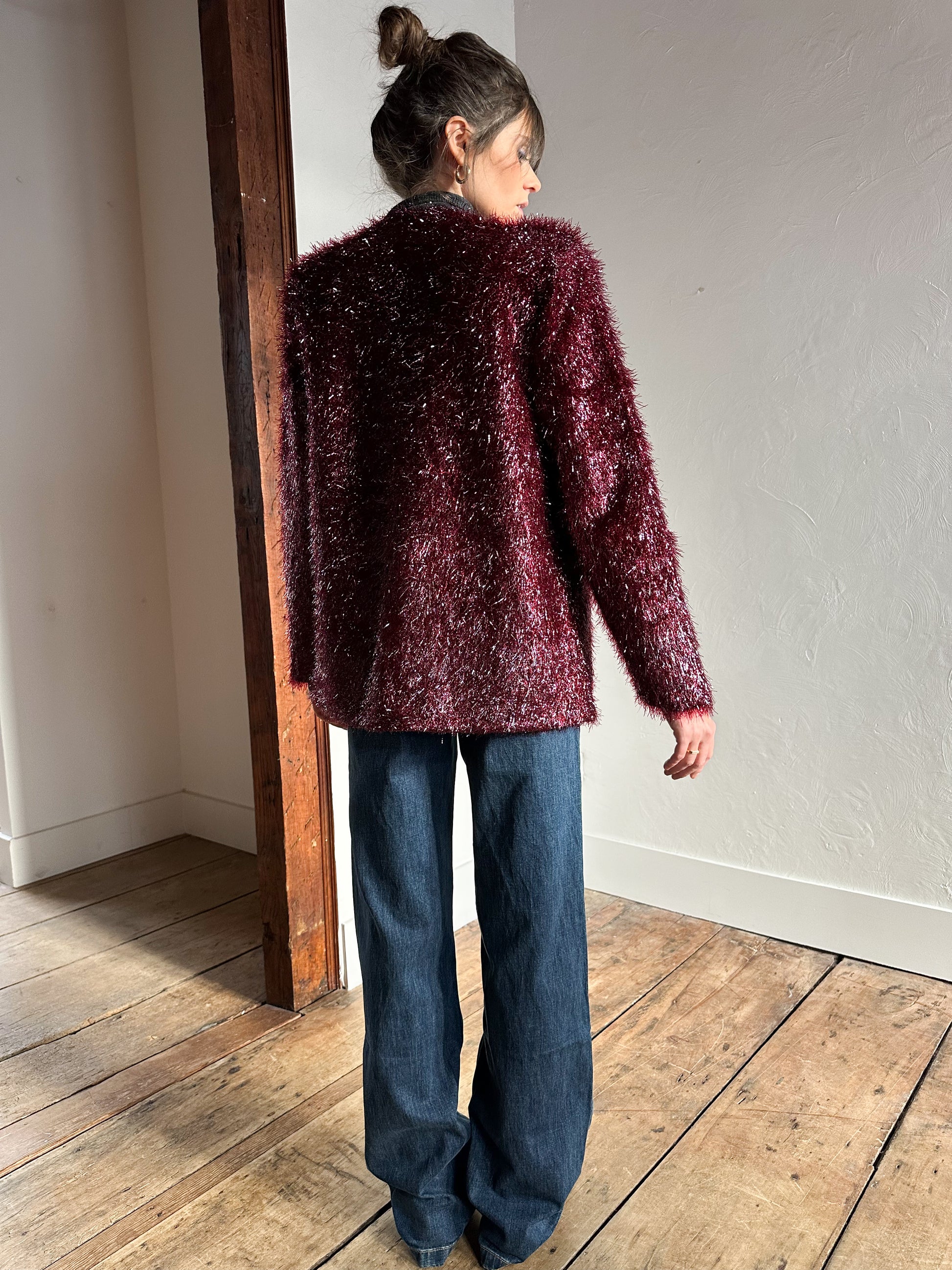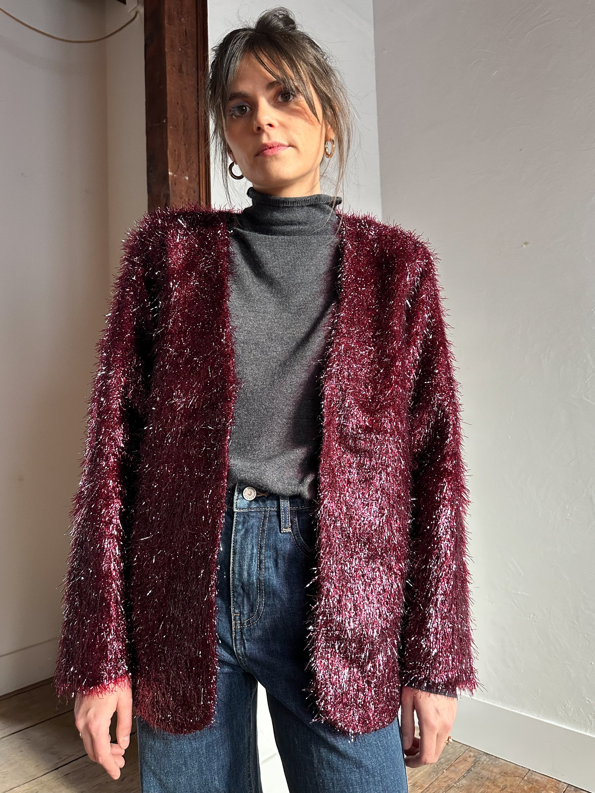 Dare to be subtly extravagant with the JEANNE shiny fur jacket. Its luminous fur-like texture is enhanced by a deep, chic plum color, perfect for brightening up your evening or winter outfits. This piece combines boldness and structure for a memorable look!