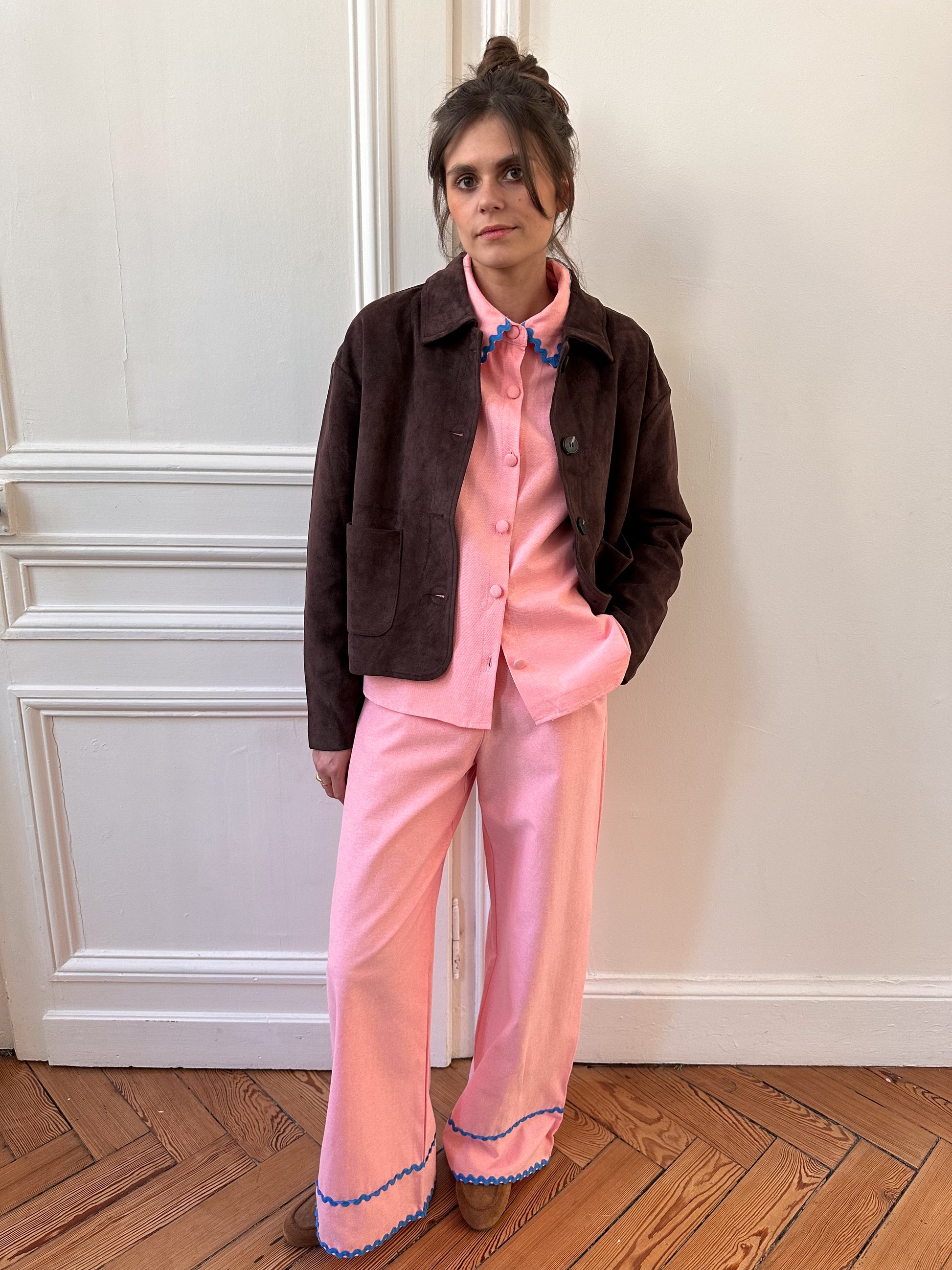 This one-of-a-kind piece stands out for its romantic-chic style and contrasting details. Its Pink hue, accented with a bright blue trim, makes it the perfect choice to brighten up your seasonal outfits.