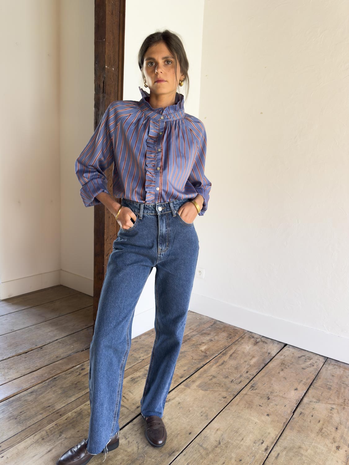 Affirmez votre style avec la chemise ALVARO, une pièce forte qui mêle allure classique et détails féminins. Son tissu rayé bleu, rouge et blanc dynamise la silhouette, tandis que son col volanté et sa boutonnière froncée apportent du relief et une touche couture. Un modèle audacieux, parfait pour créer une tenue travaillée !