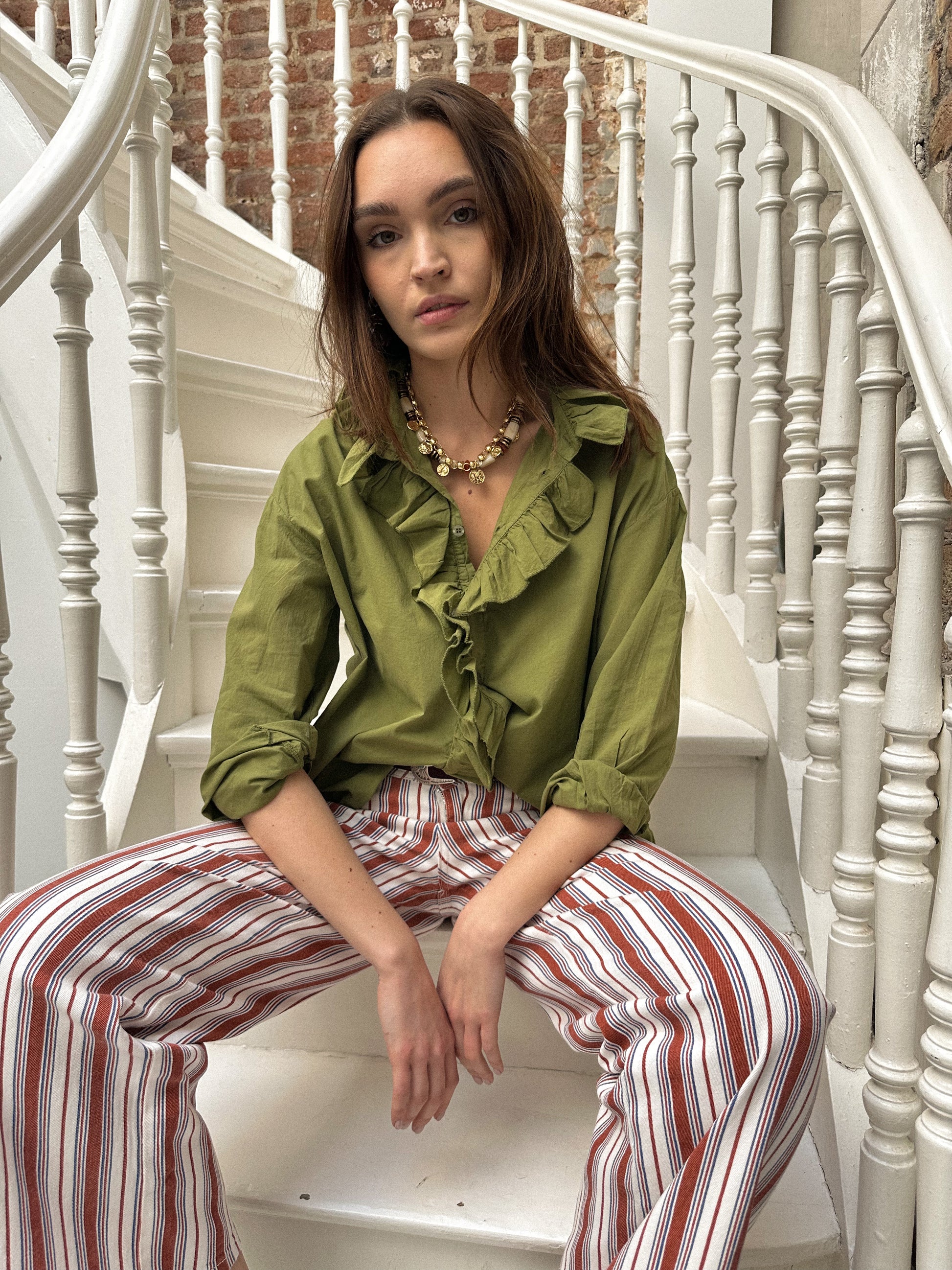 Alliant charme romantique et allure décontractée, la blouse HELOISE se distingue par son col volanté et sa patte de boutonnage ornée de froufrous. Sa coupe fluide et sa teinte olive en font une pièce forte, idéale pour réveiller un jean brut !
