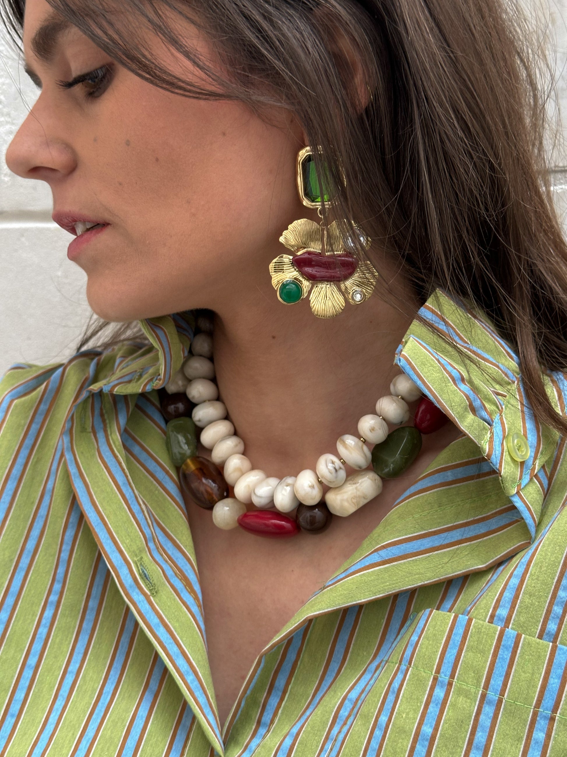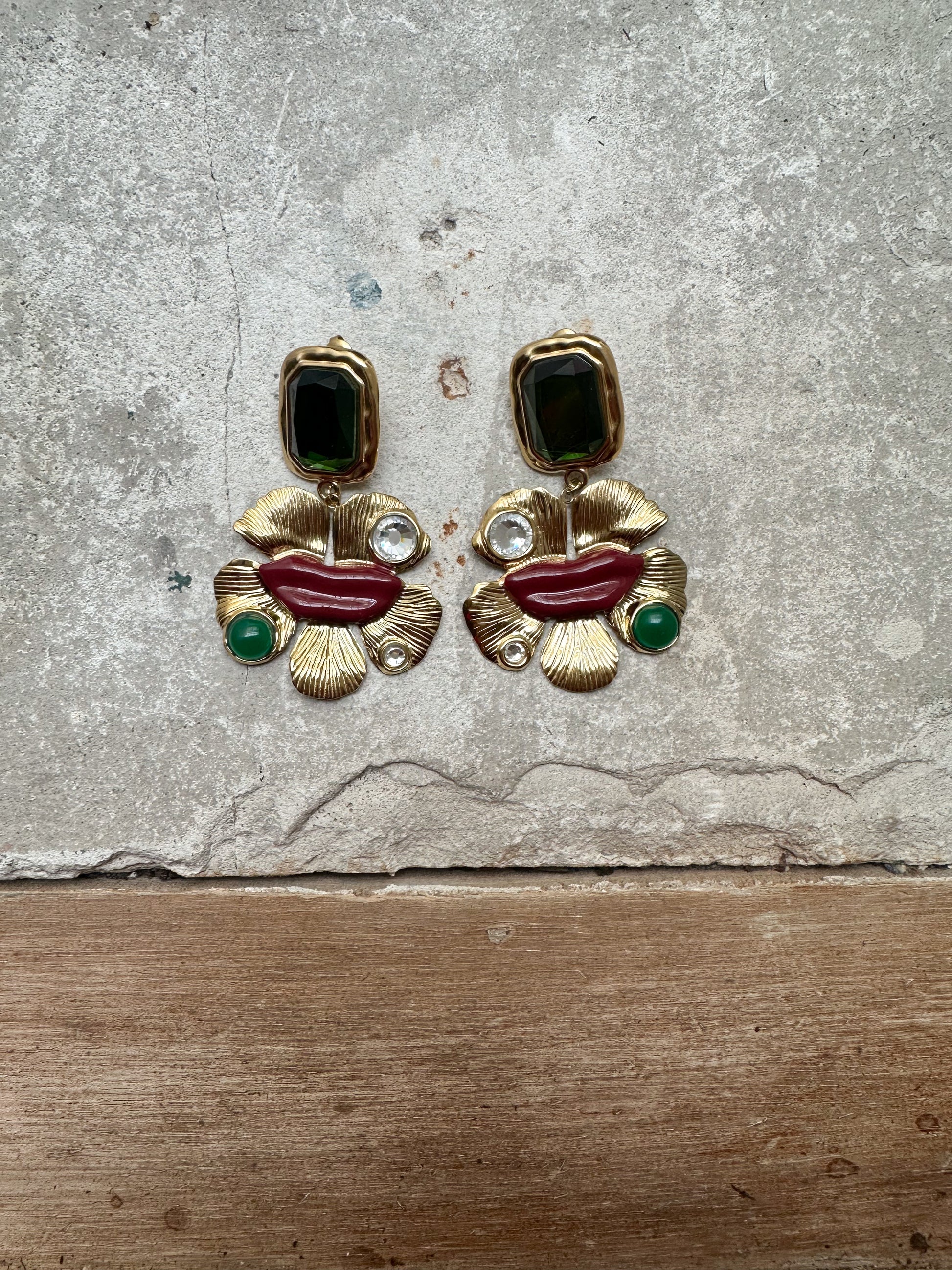Affirmez votre style avec ces boucles d'oreilles pendantes au design audacieux et poétique. Les boucles CLAIRE se distinguent par leur motif central en forme de bouche, délicatement posé sur une fleur stylisée aux pétales nervurés.
