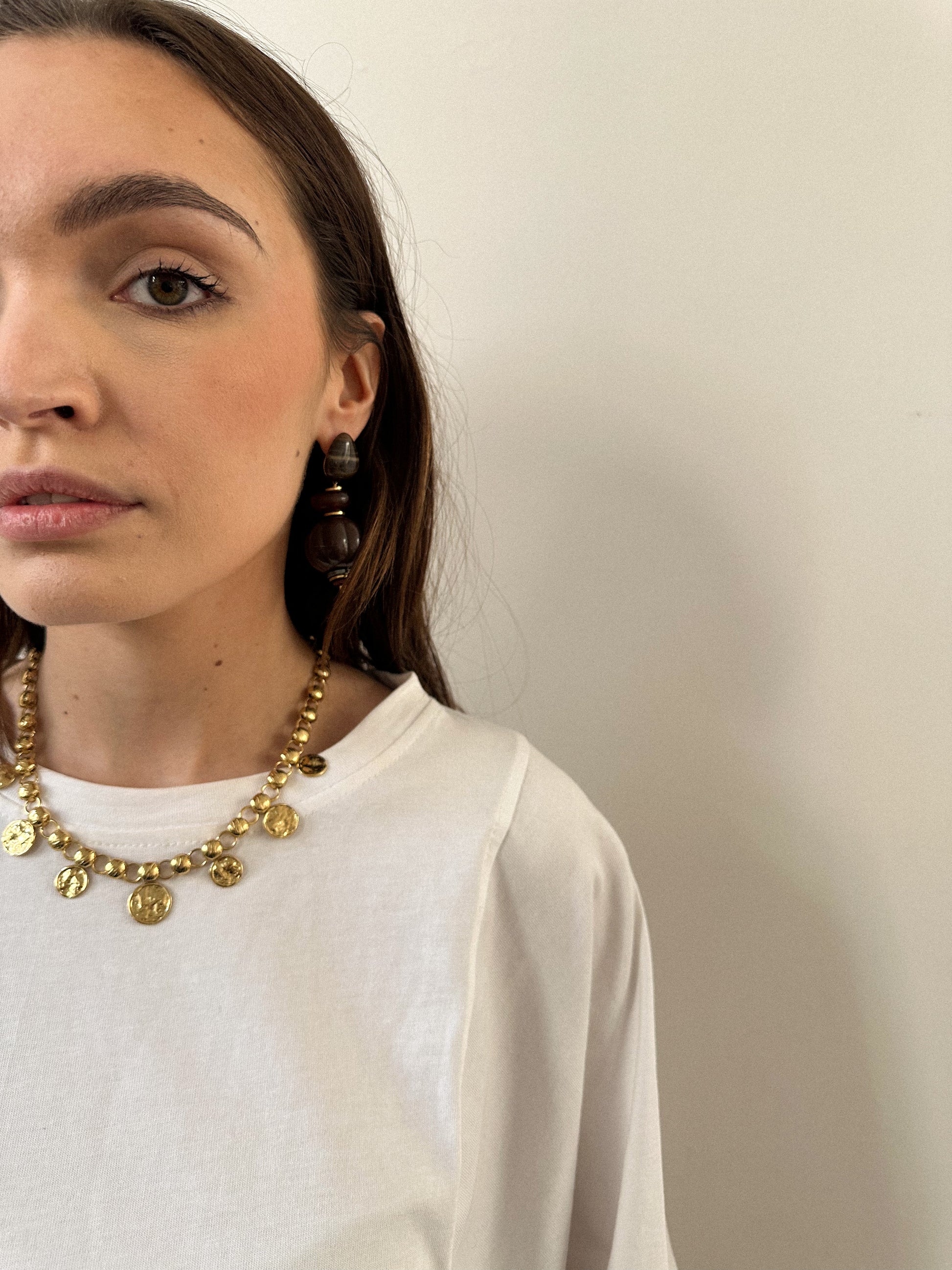 Avec ses pampilles "pièces" d'inspiration antique et sa chaîne perlée, le collier MARIUS apporte une touche bohème-chic immédiate.