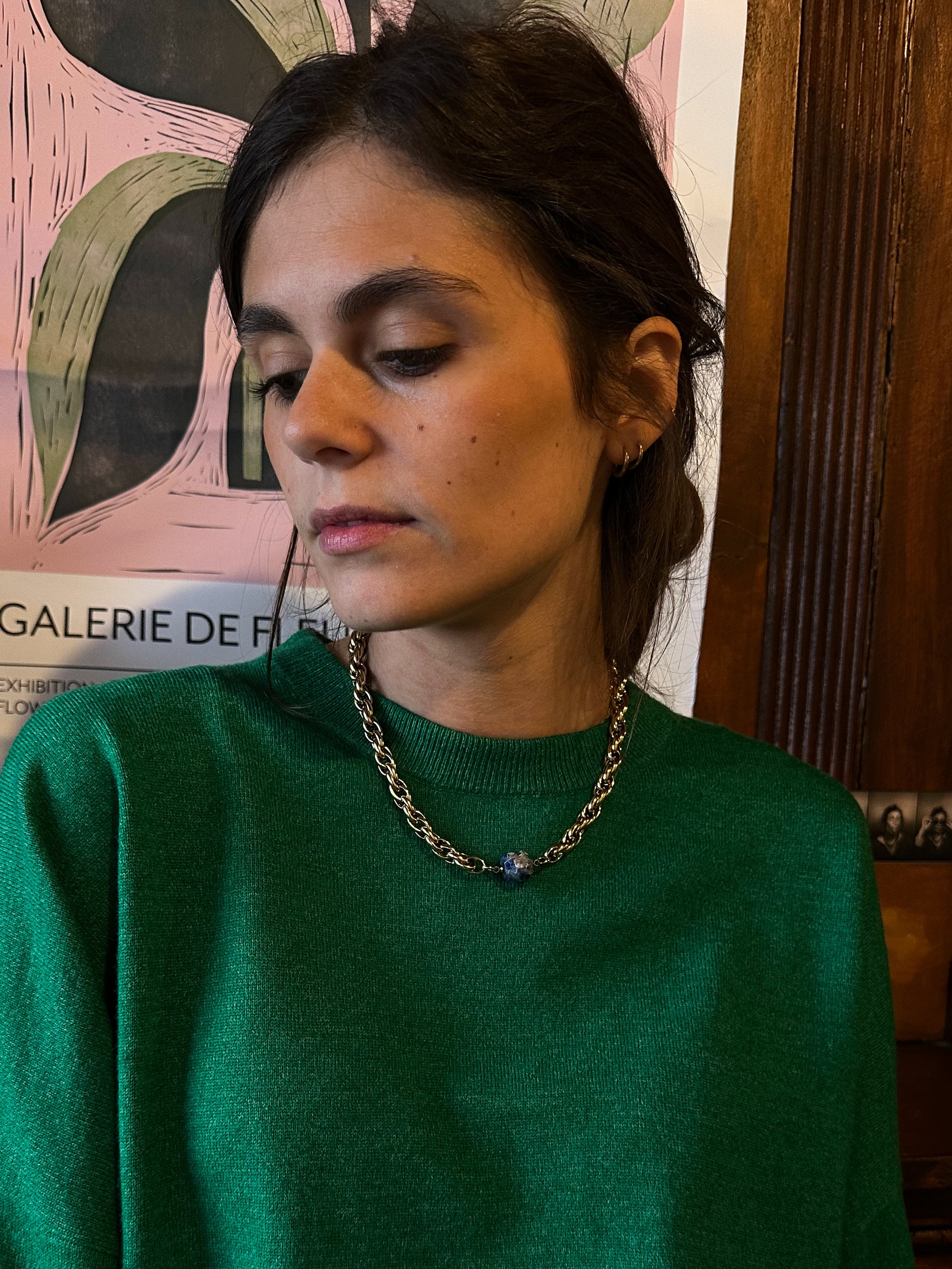 Le collier ORIA est composé d'une chaîne épaisse à maillons tressés couleur dorée. En son centre, une pierre bleue de sodalite vient sublimer l’ensemble, apportant une touche de couleur subtile et raffinée.