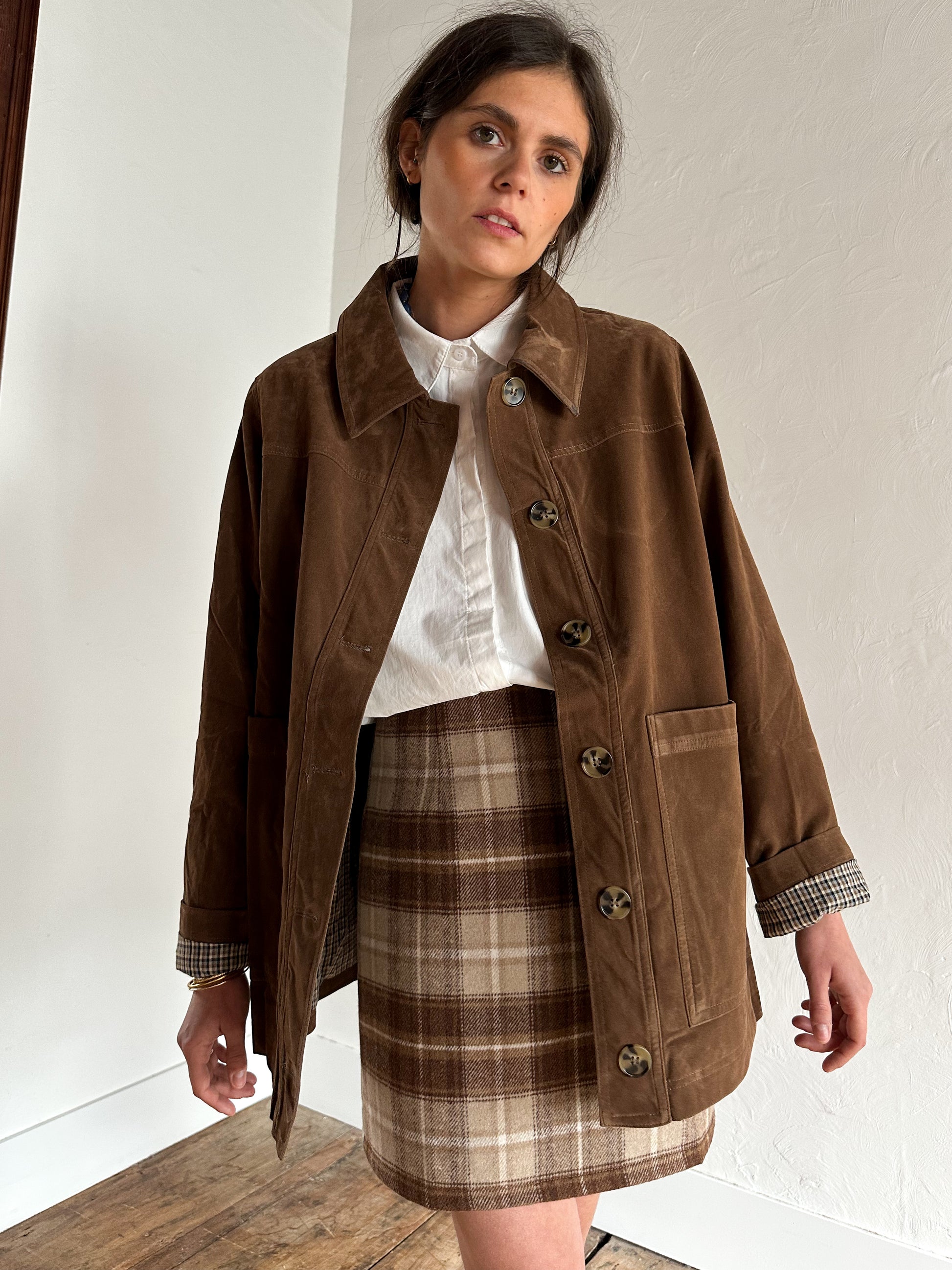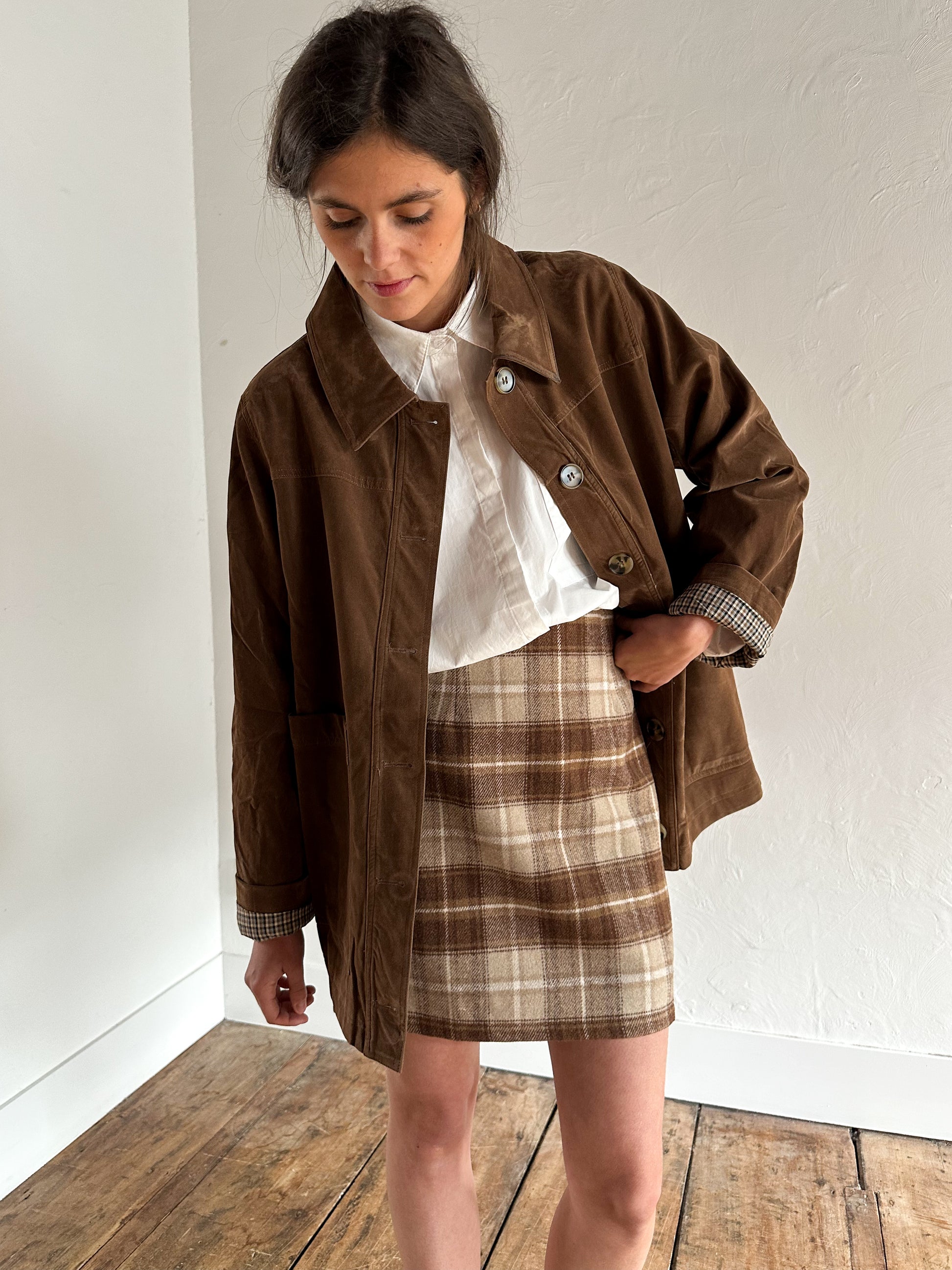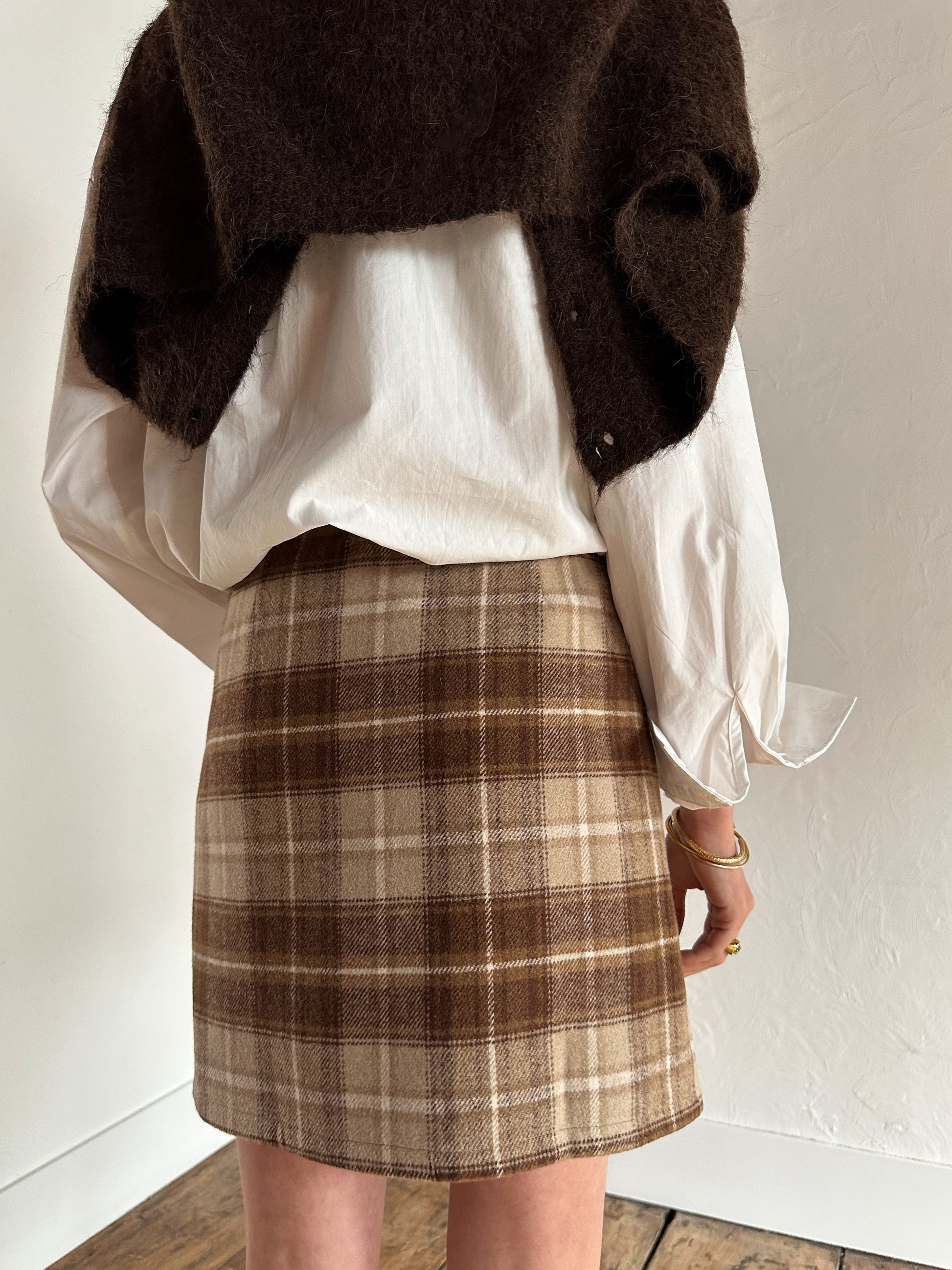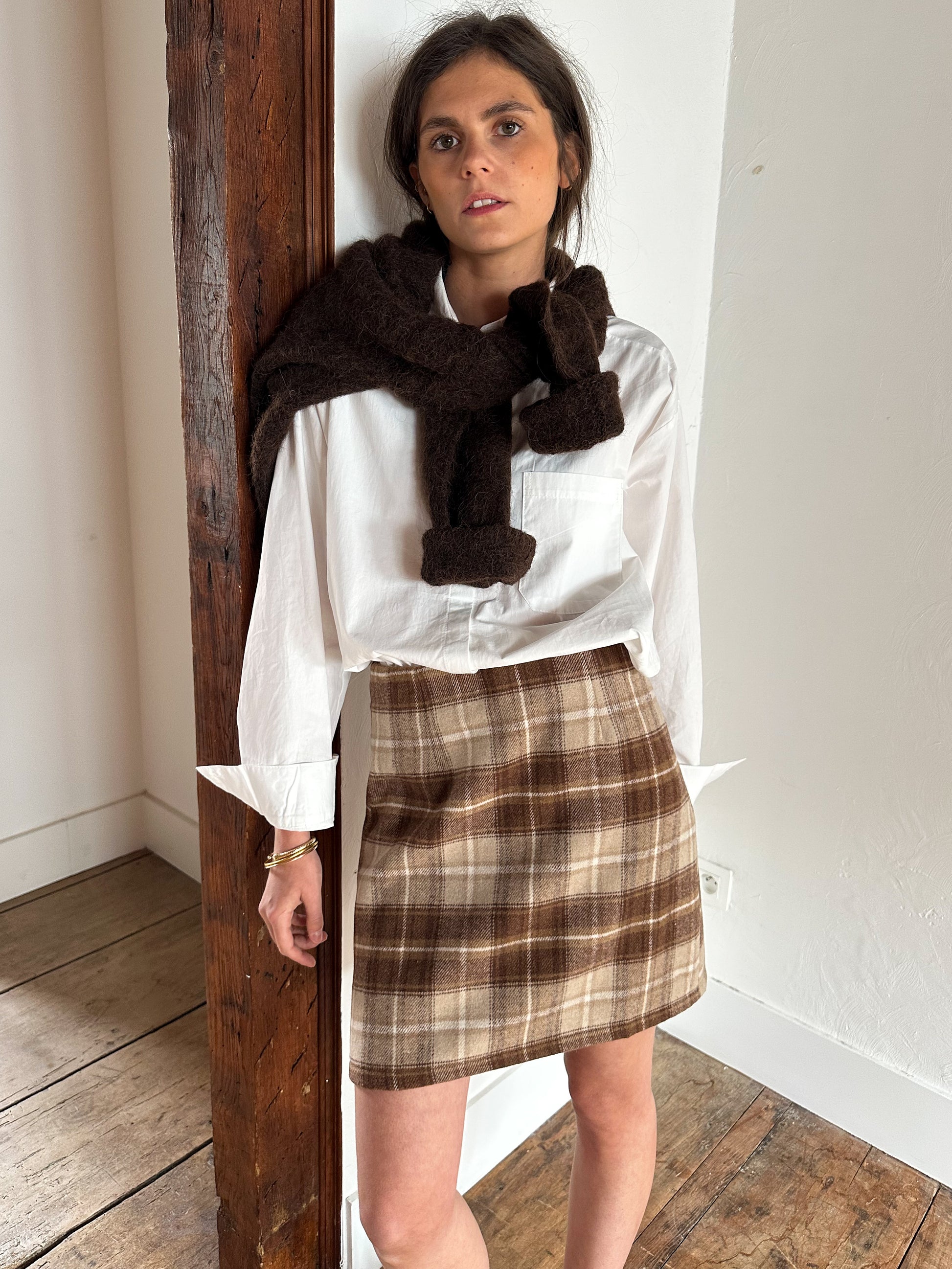 La jupe SWAN séduit par son allure rétro et son motif à carreaux dans des tons chauds de beige et de marron. Sa coupe droite met en valeur la silhouette tout en restant confortable au quotidien.
