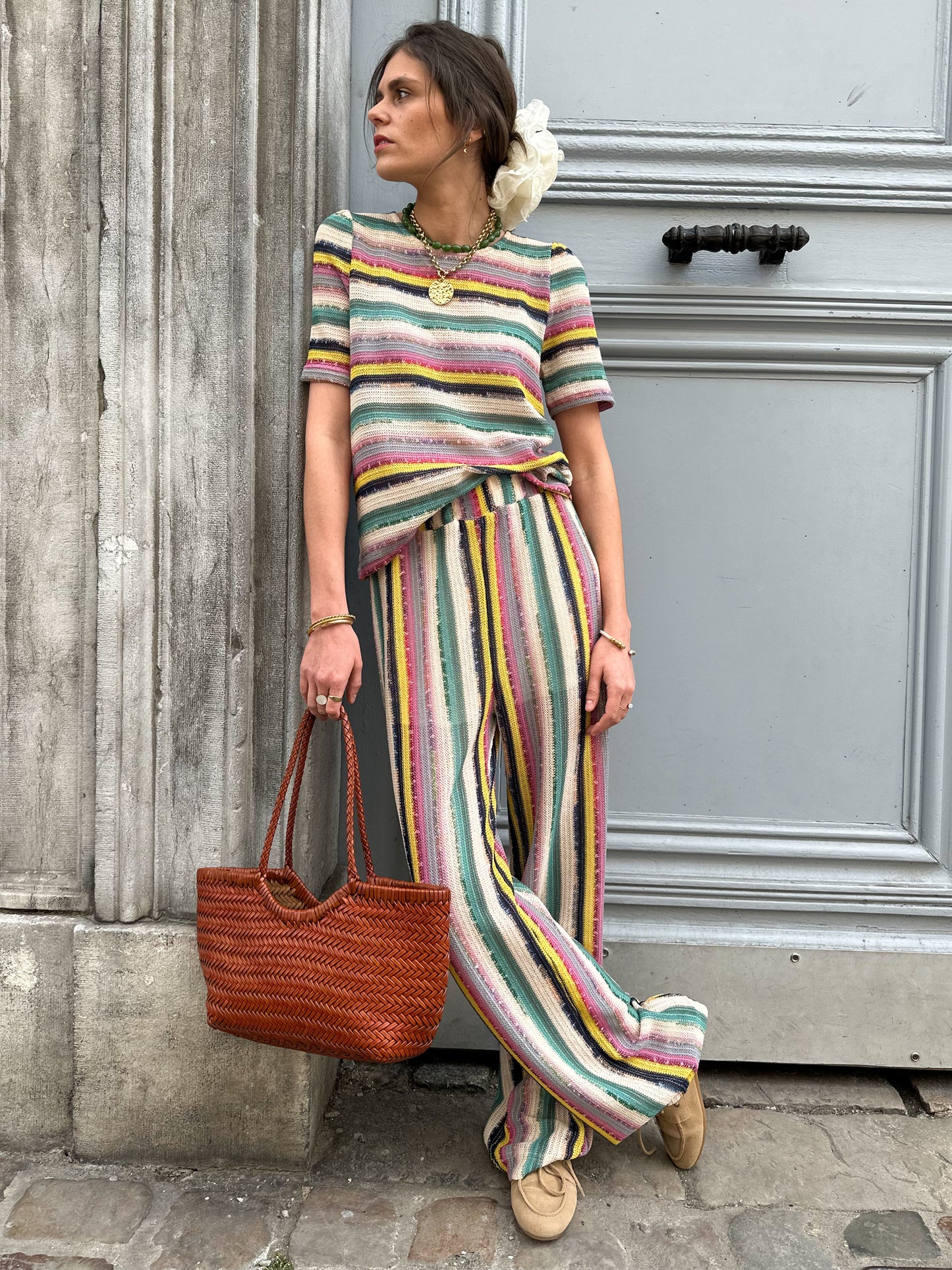 Un pantalon tissé à rayures au charme artisanal, parfait pour une allure bohème et estivale. Sa doublure courte assure confort et opacité, tandis que la taille élastique s’adapte en douceur à toutes les morphologies. Léger, texturé et facile à associer, c’est la pièce idéale pour flâner avec style.