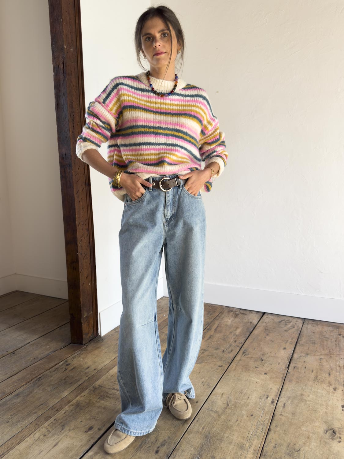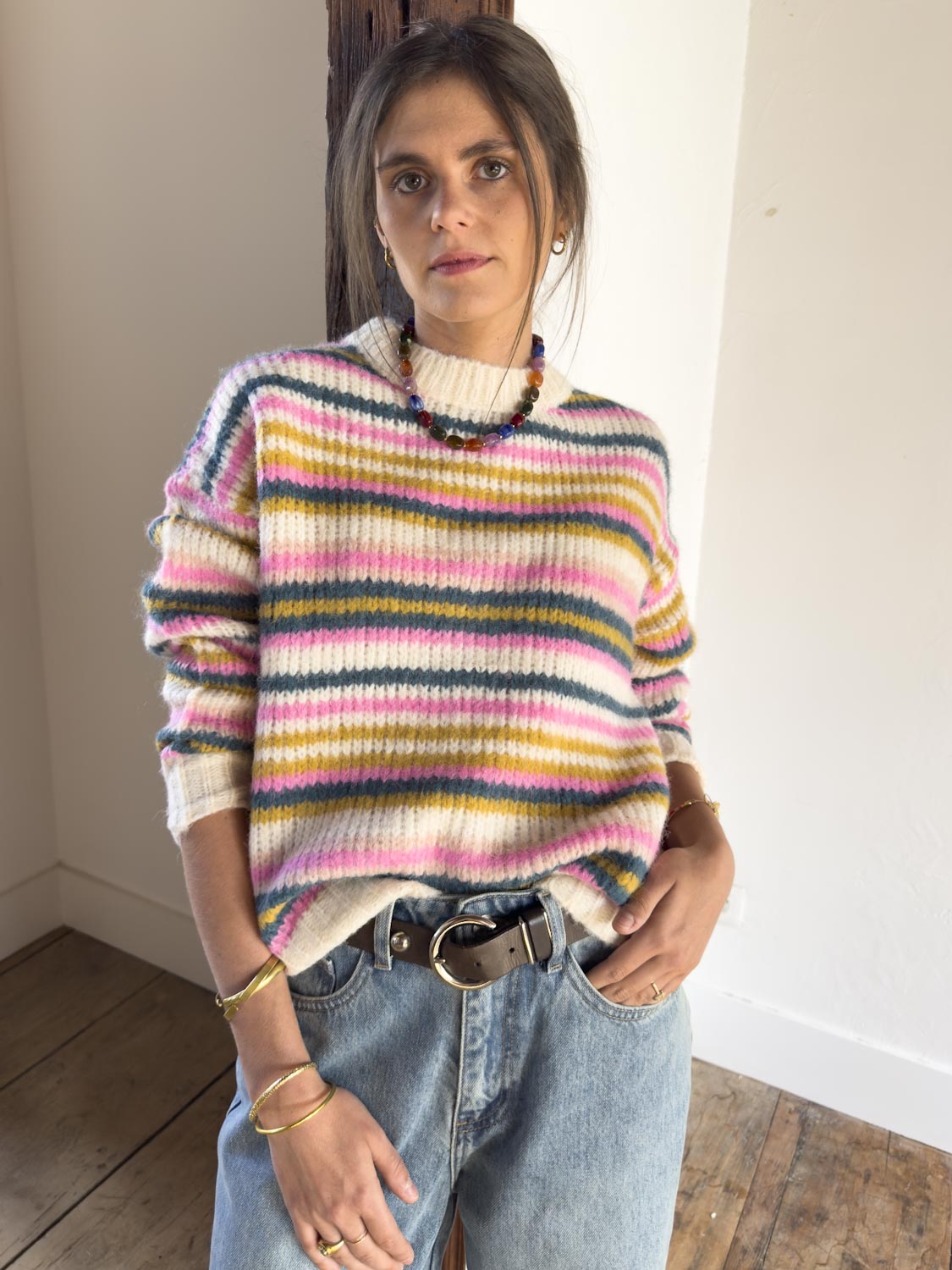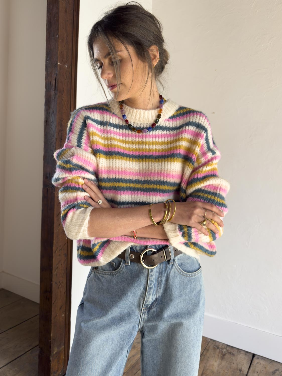 - Pull à rayures (rose, verte, moutarde, bleue),