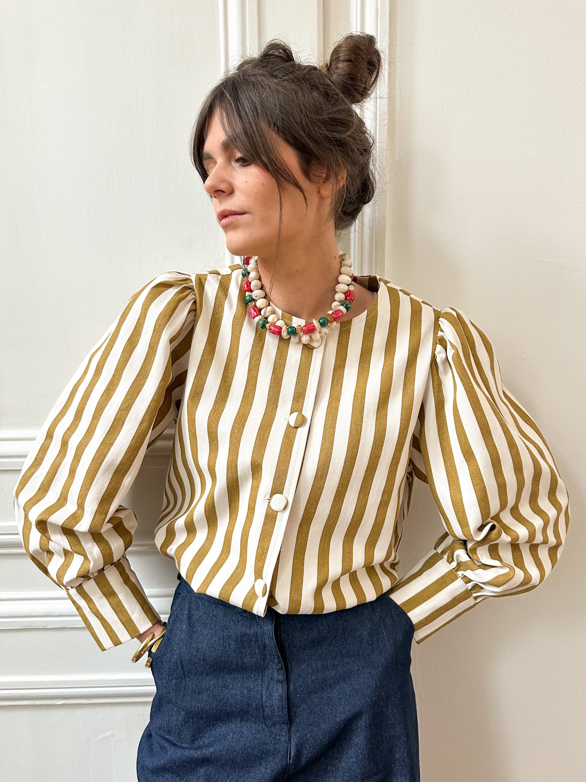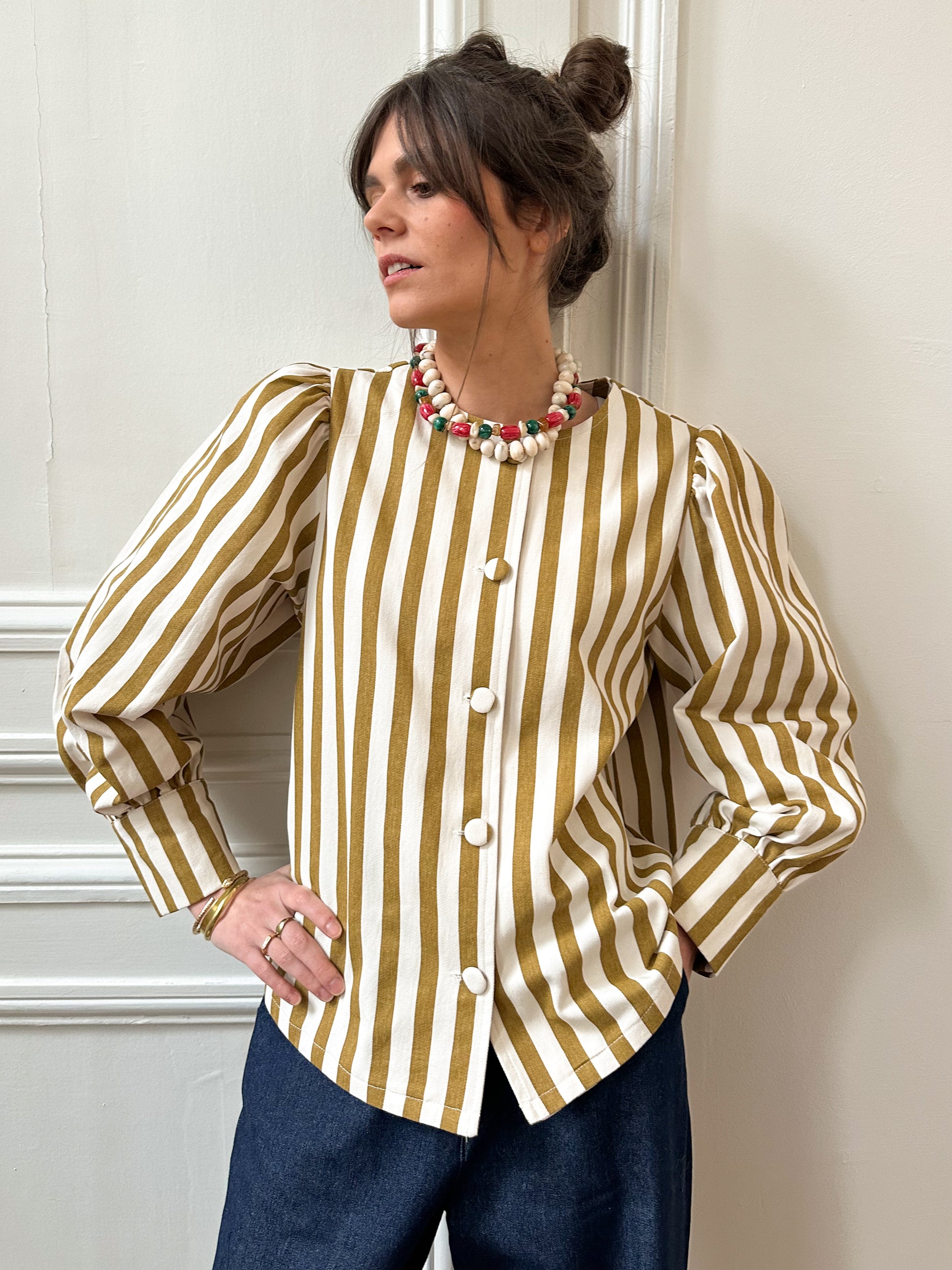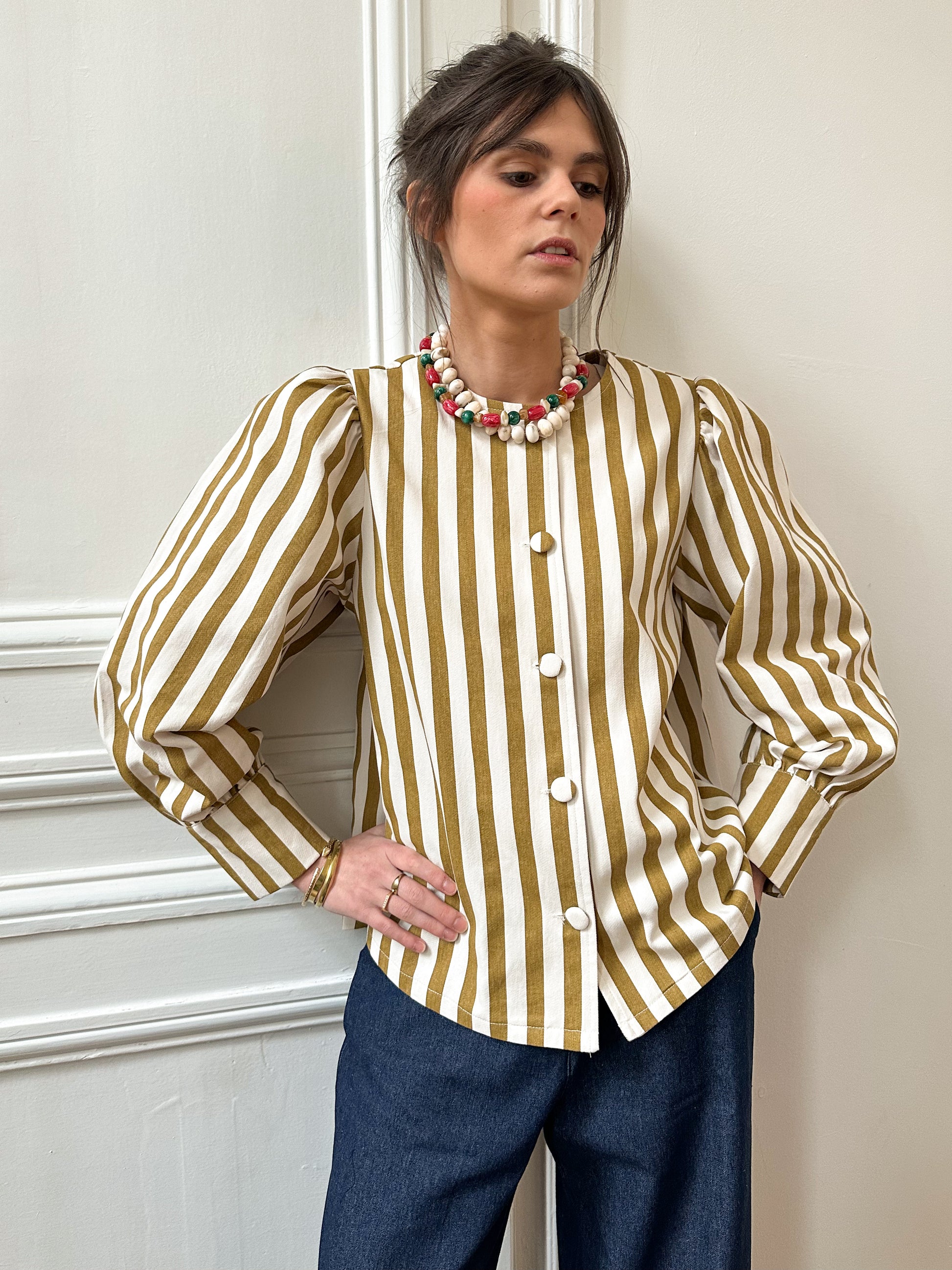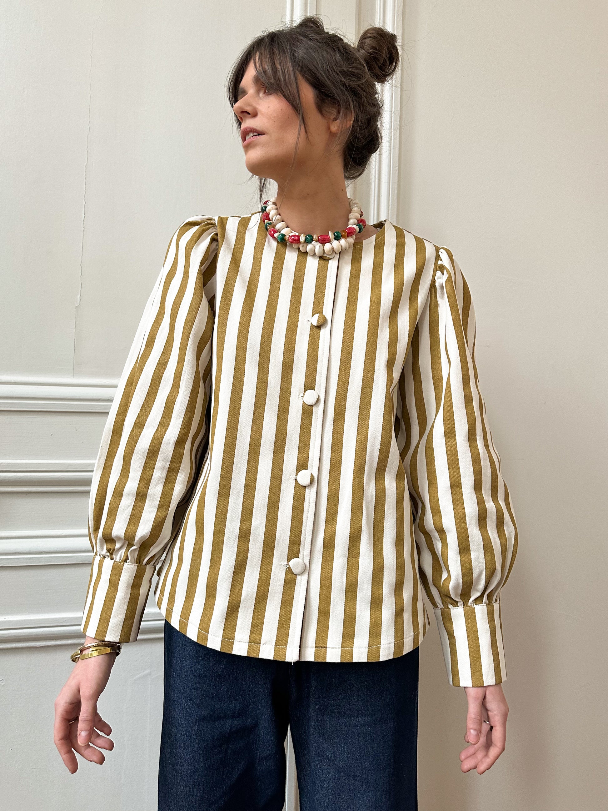 Affirmez votre style avec la veste AXEL, une pièce hybride à mi-chemin entre la blouse structurée et la veste légère. Elle se distingue par son motif à rayures verticales larges dans une teinte moutarde/ocre chaleureuse sur fond blanc cassé, offrant une silhouette à la fois moderne et intemporelle.