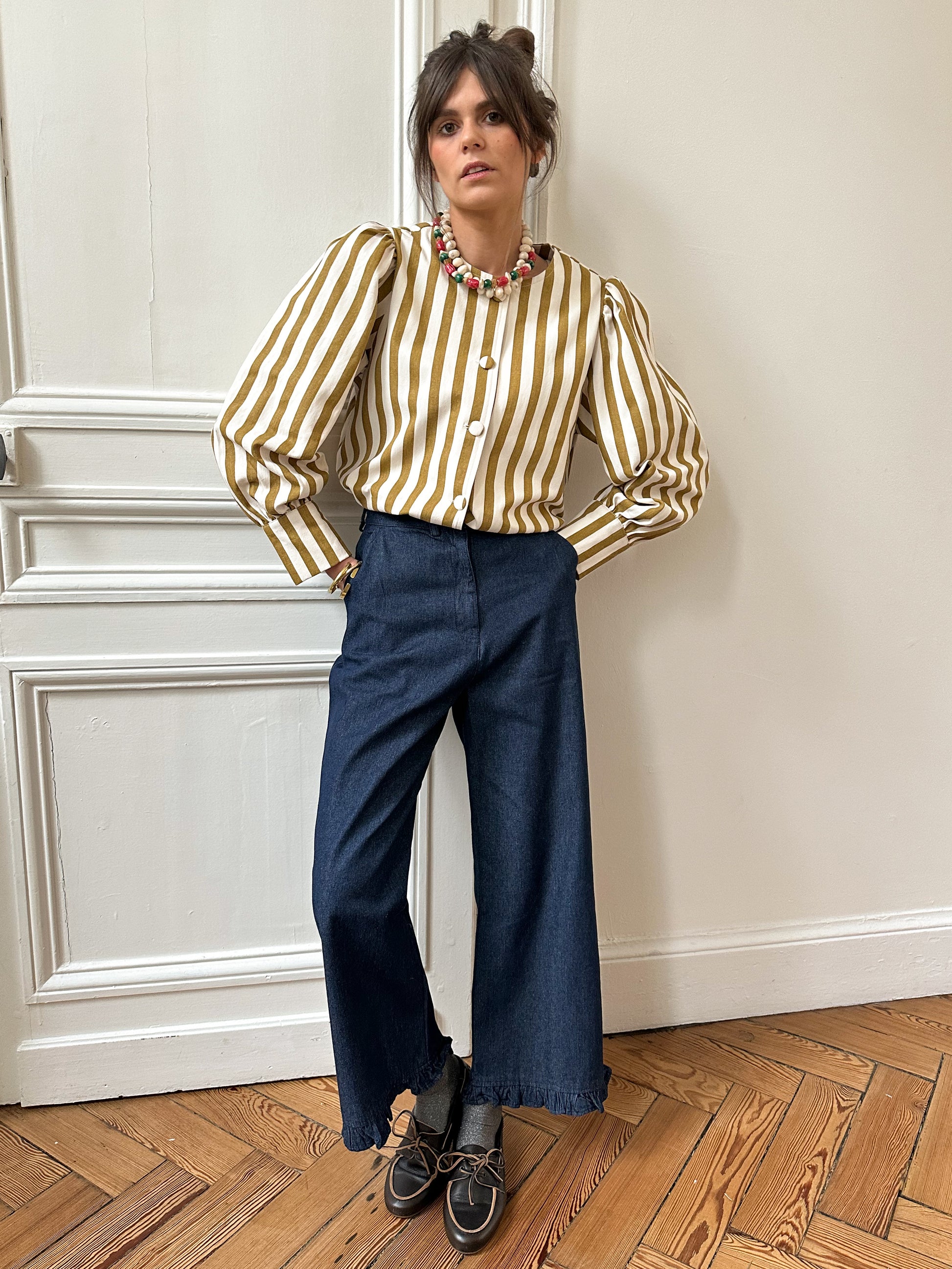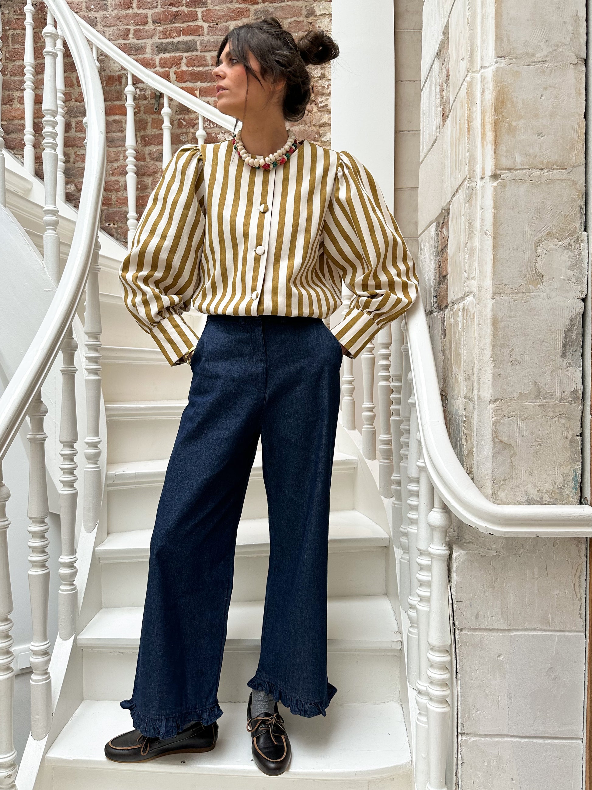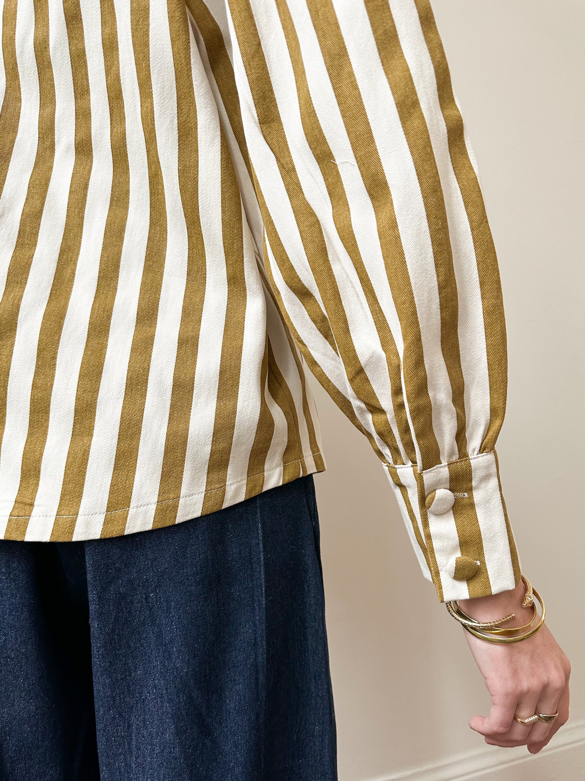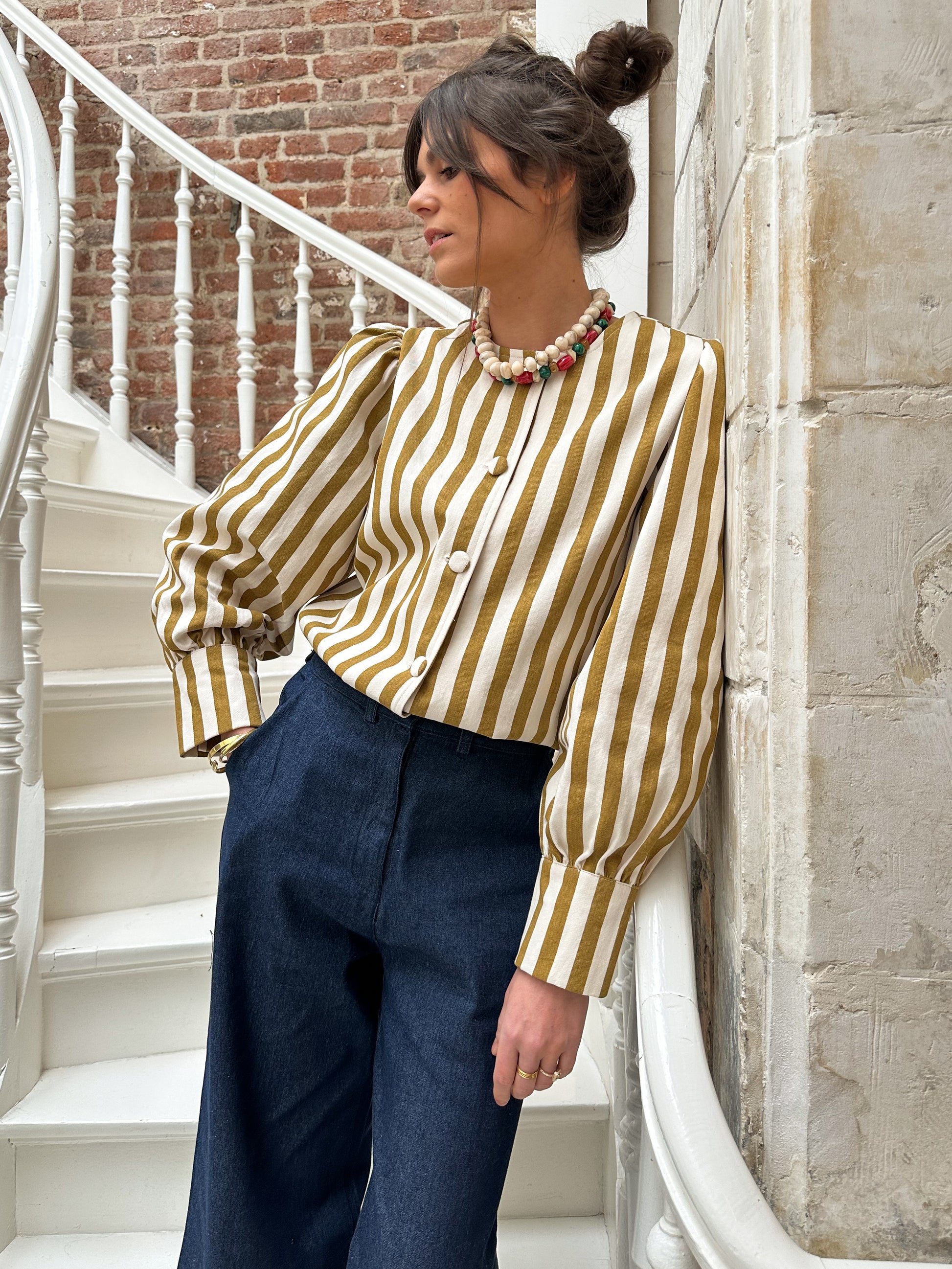 Affirmez votre style avec la veste AXEL, une pièce hybride à mi-chemin entre la blouse structurée et la veste légère. Elle se distingue par son motif à rayures verticales larges dans une teinte moutarde/ocre chaleureuse sur fond blanc cassé, offrant une silhouette à la fois moderne et intemporelle.