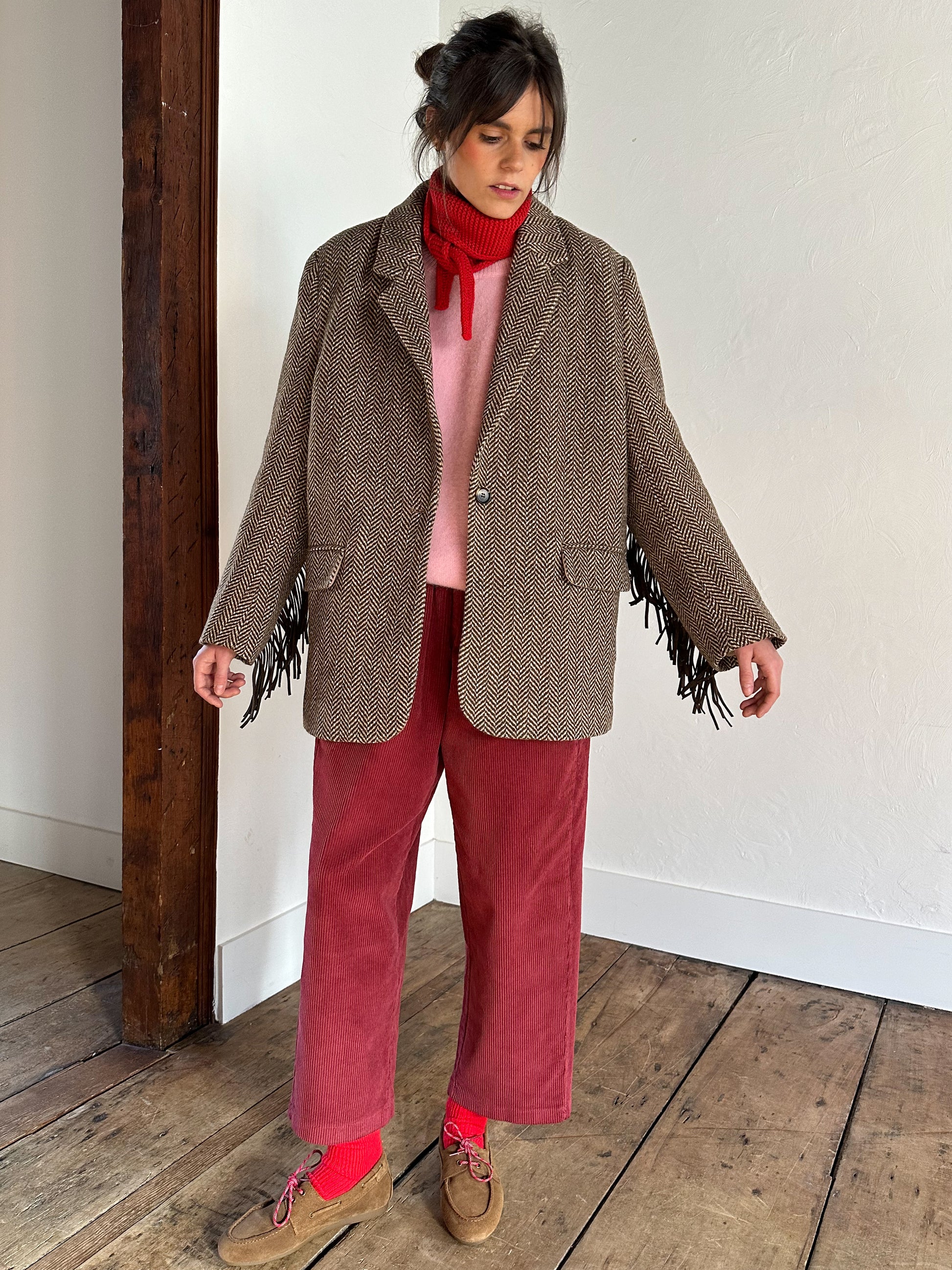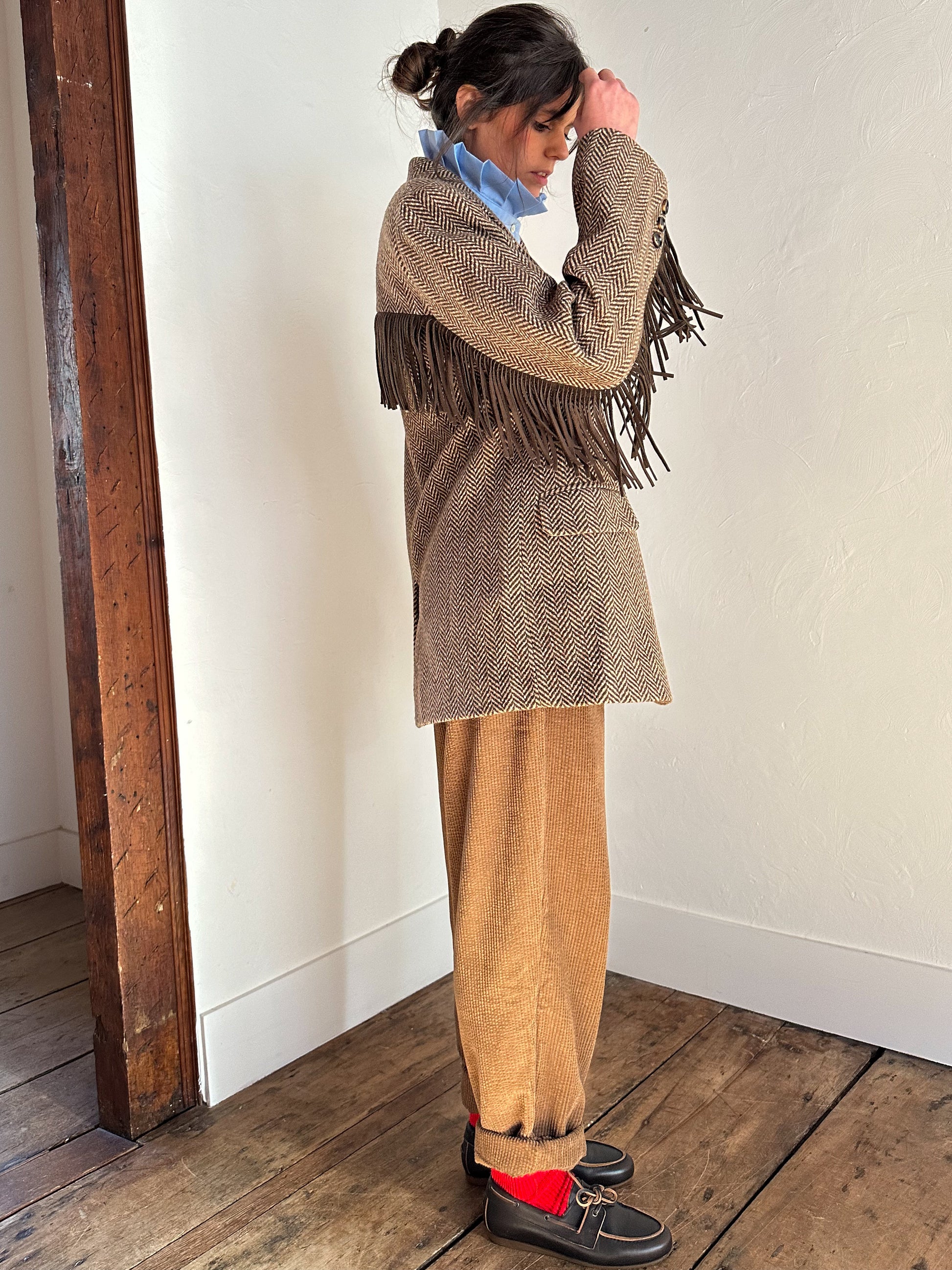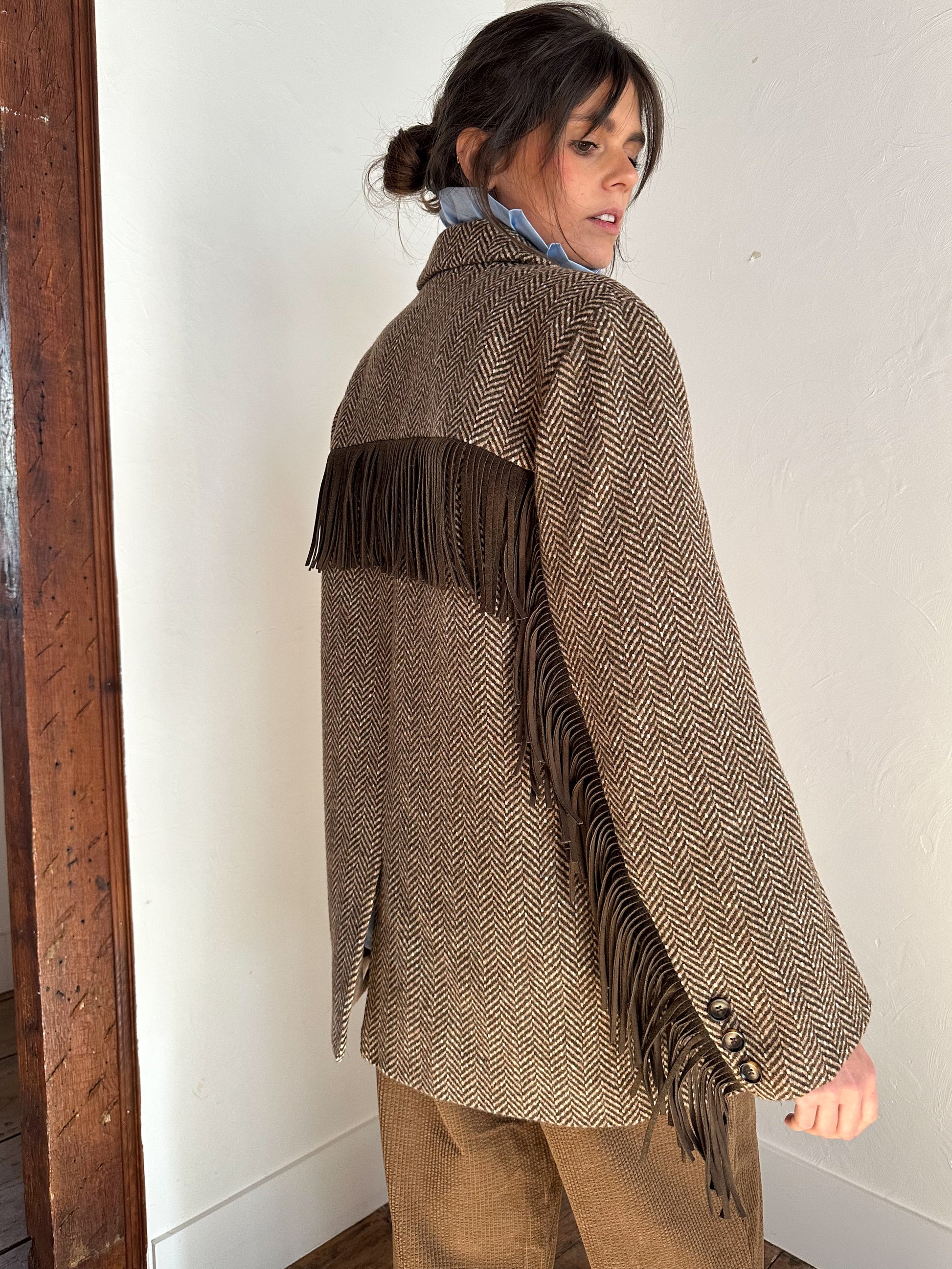 Les franges chocolat apportent du mouvement et une note tendance, tandis que le motif chevrons classique ajoute élégance et caractère.