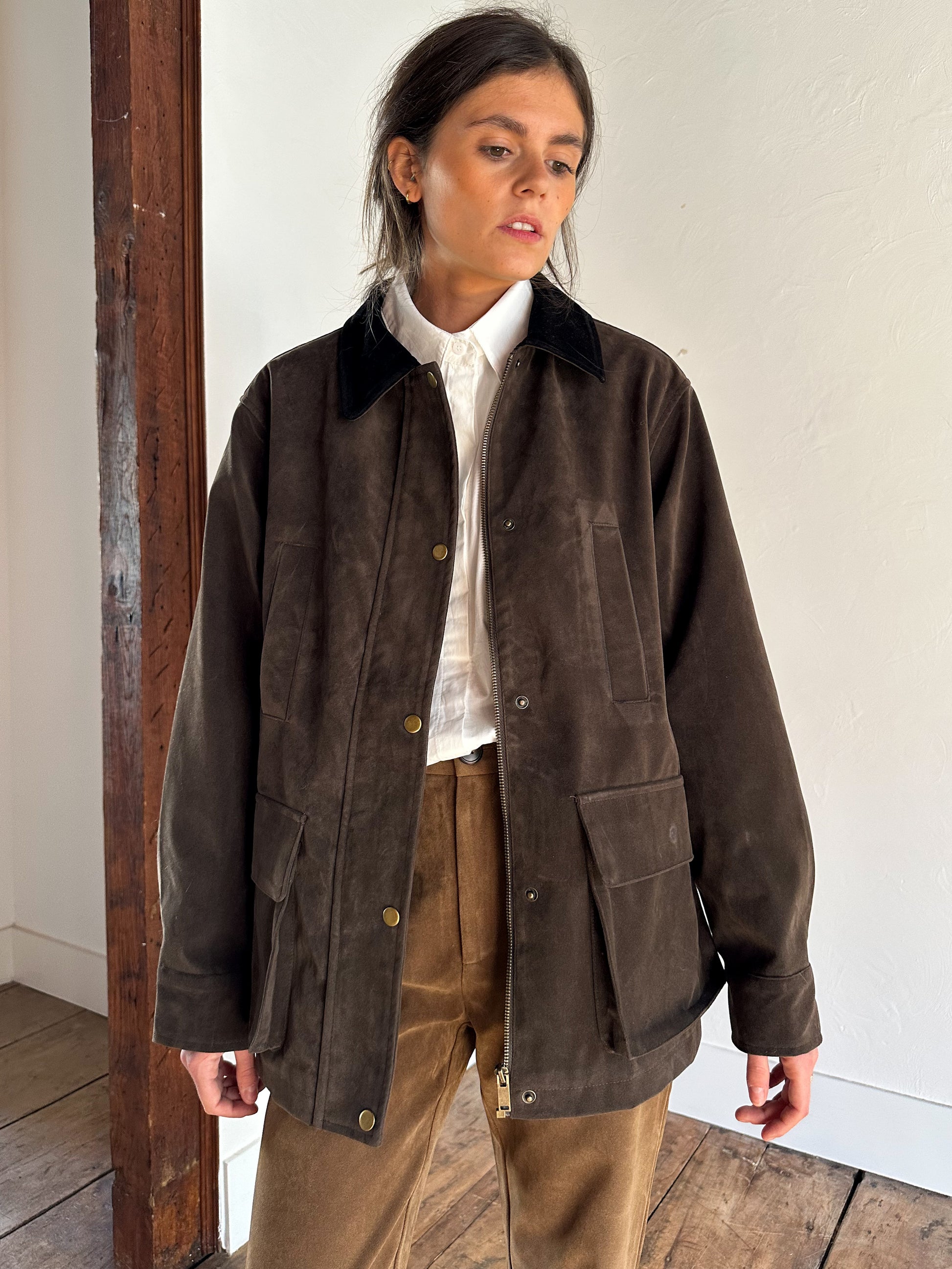 Affirmez votre style avec la veste FÉLIX qui allie charme rustique et finitions modernes. Conçue dans une matière suédine en coloris chocolat, cette veste se distingue par sa coupe esprit chasseur, idéale pour la mi-saison.