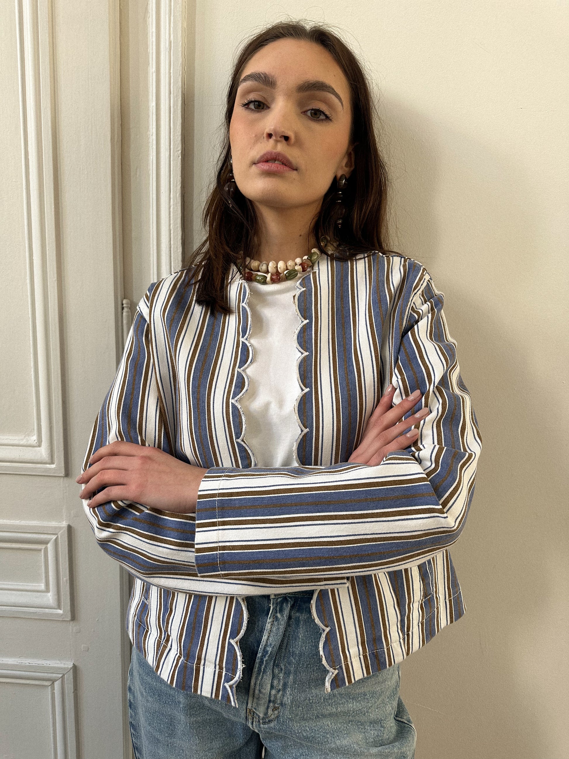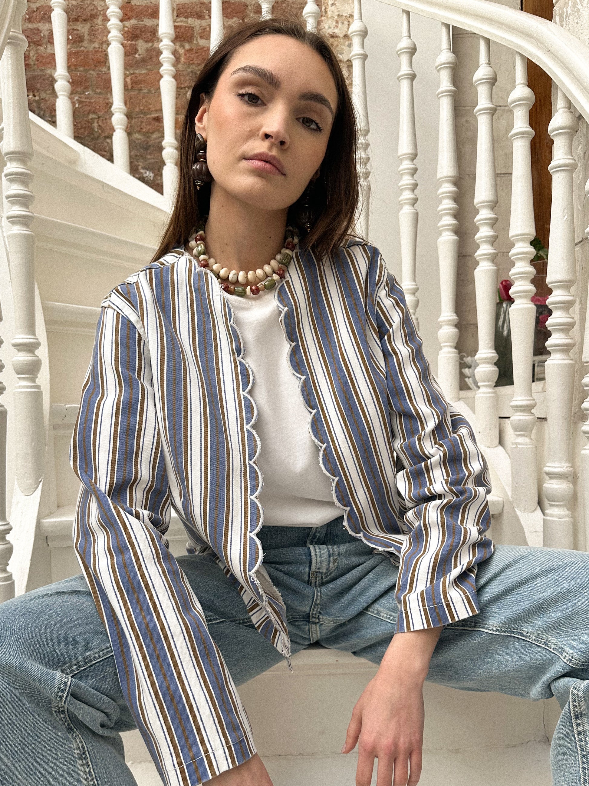Ses rayures verticales allongent la silhouette, tandis que sa bordure festonnée apporte une touche de douceur et de féminité à sa coupe structurée.