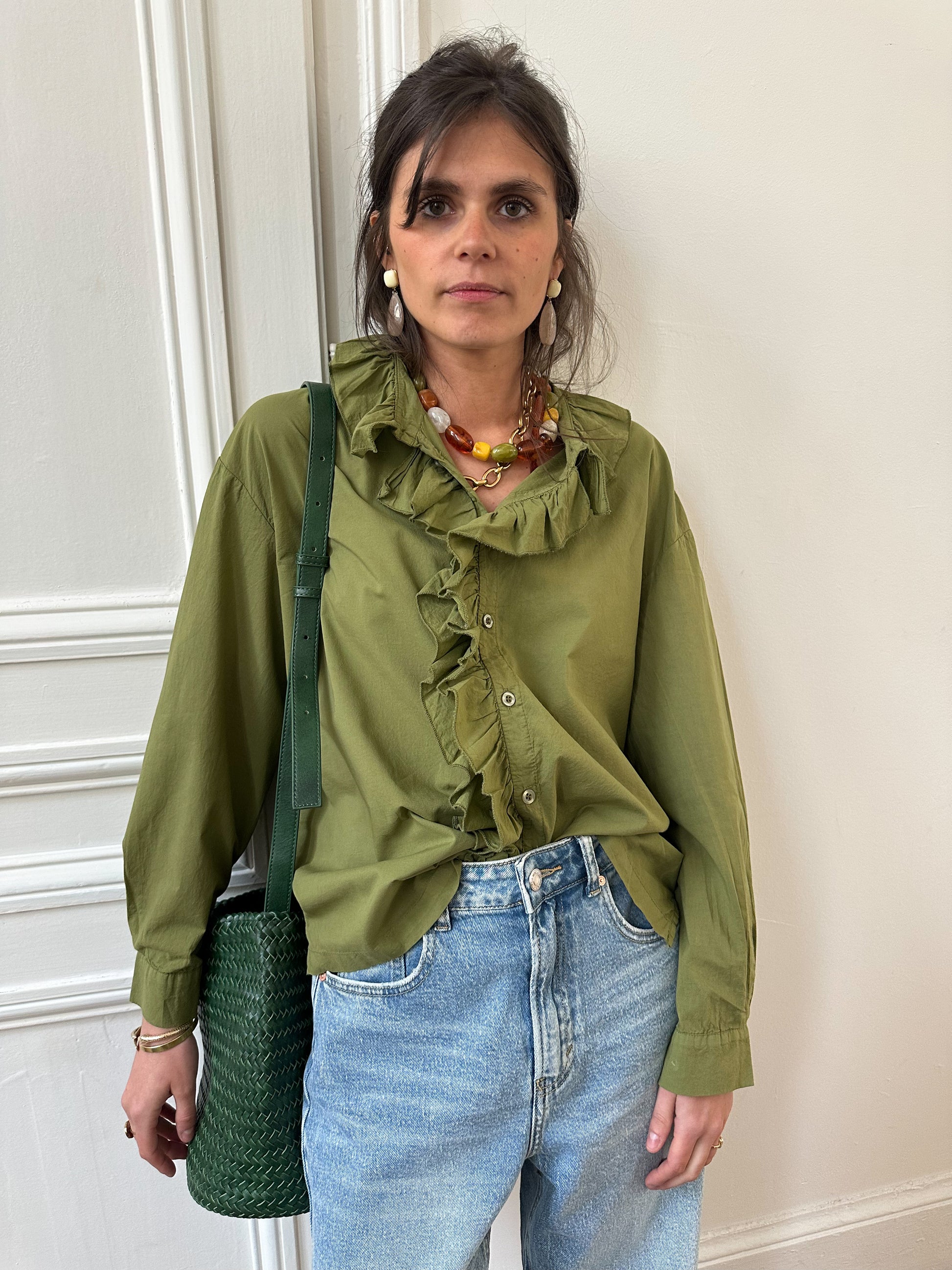 Alliant charme romantique et allure décontractée, la blouse HELOISE se distingue par son col volanté et sa patte de boutonnage ornée de froufrous. Sa coupe fluide et sa teinte olive en font une pièce forte, idéale pour réveiller un jean brut !